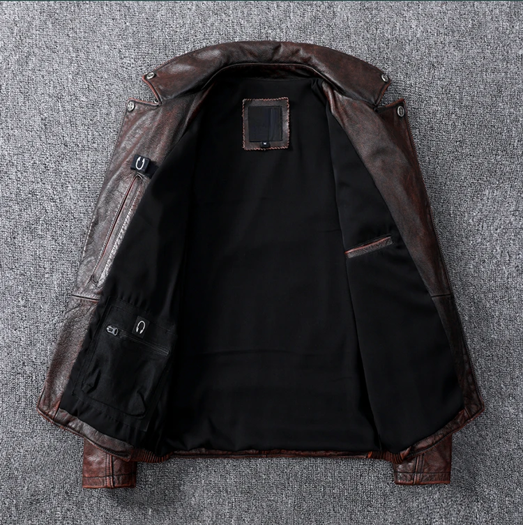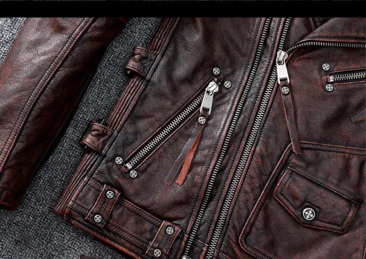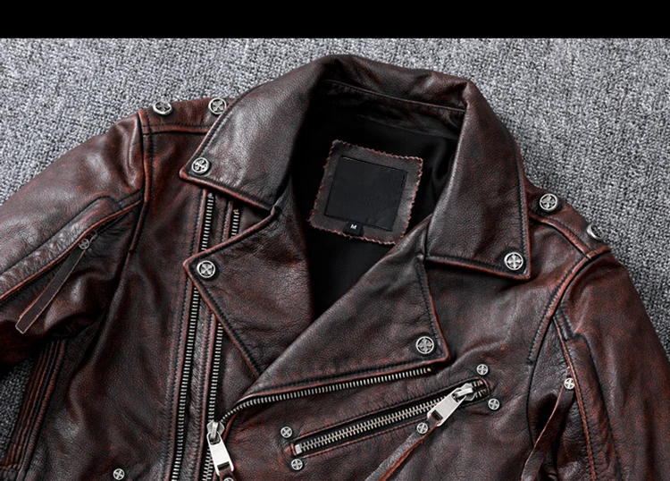 Vintage Brown Motorcycle Leather Jacket Men Natural Genuine Cowhide Jackets Autumn Slim Fit Biker's Ooblique Zipper Coat