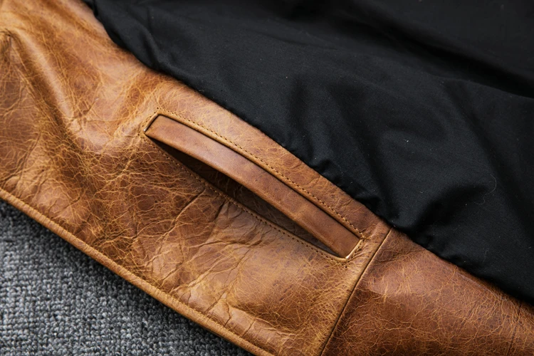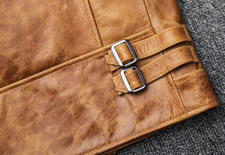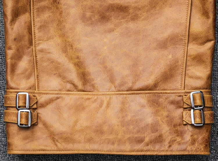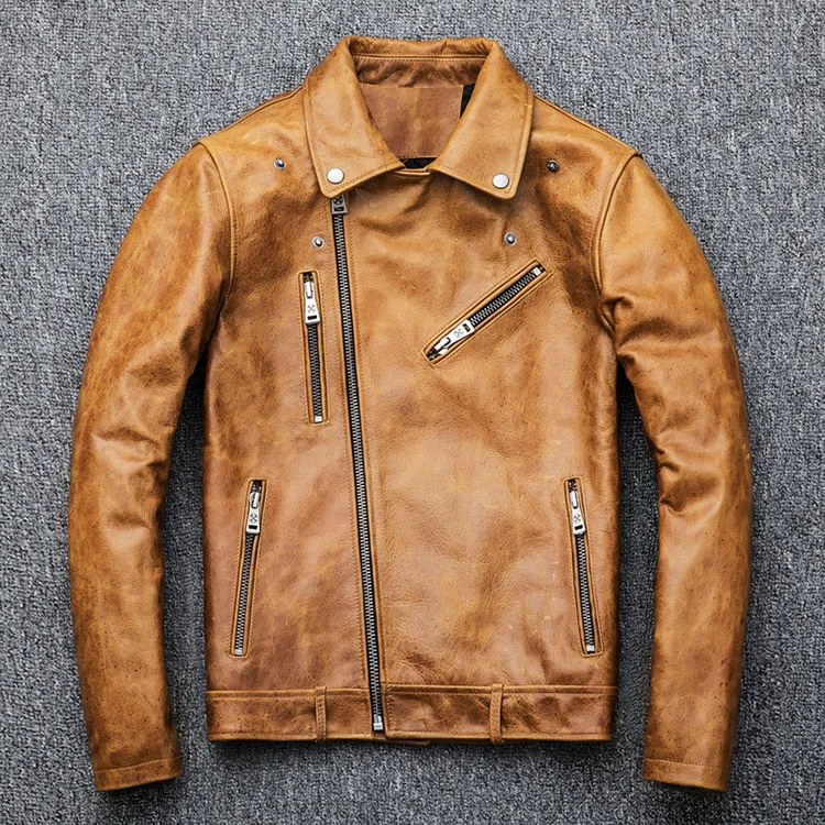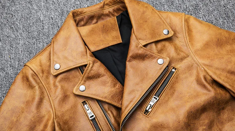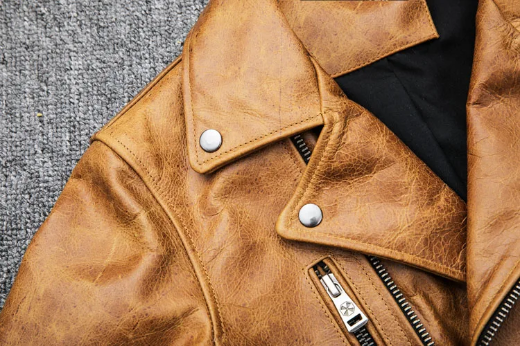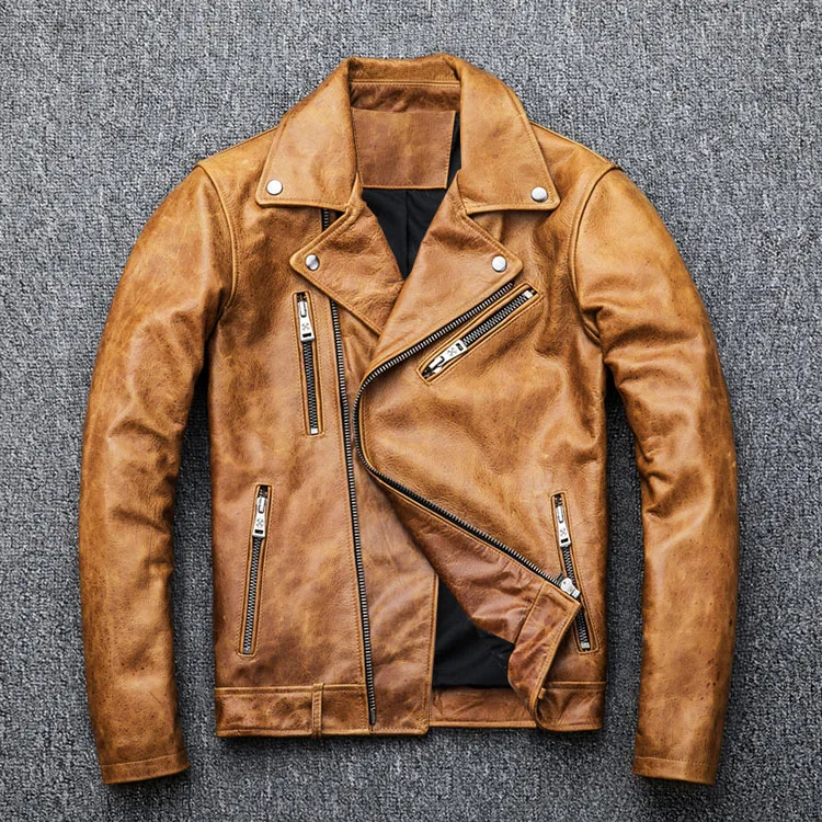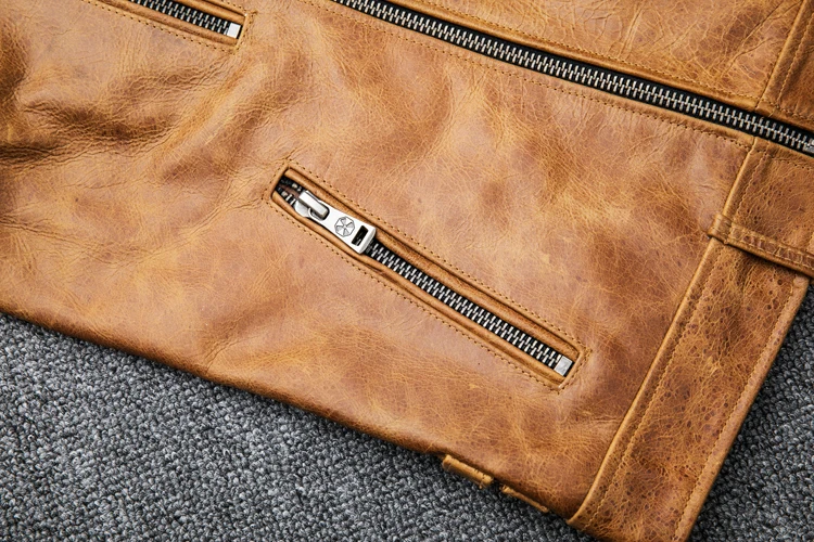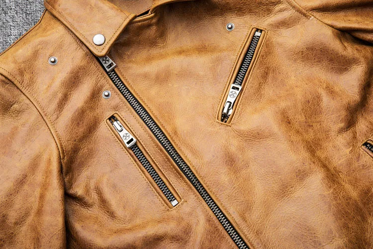 Natural Oil Wax Calf Skin Jackets Men Leather Jacket Thick Turn Down Collar Yellow Brown Men's Skin Coat Winter M098