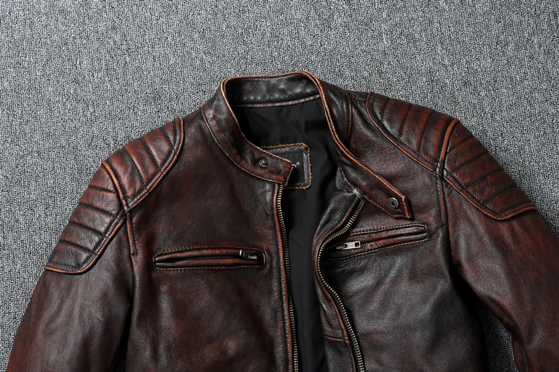 Vintage Red Brown Men Leather Jacket 100% Cowhide Jackets Slim Fit Soft Skin Coat Autumn Jaqueta Masculina De Couro