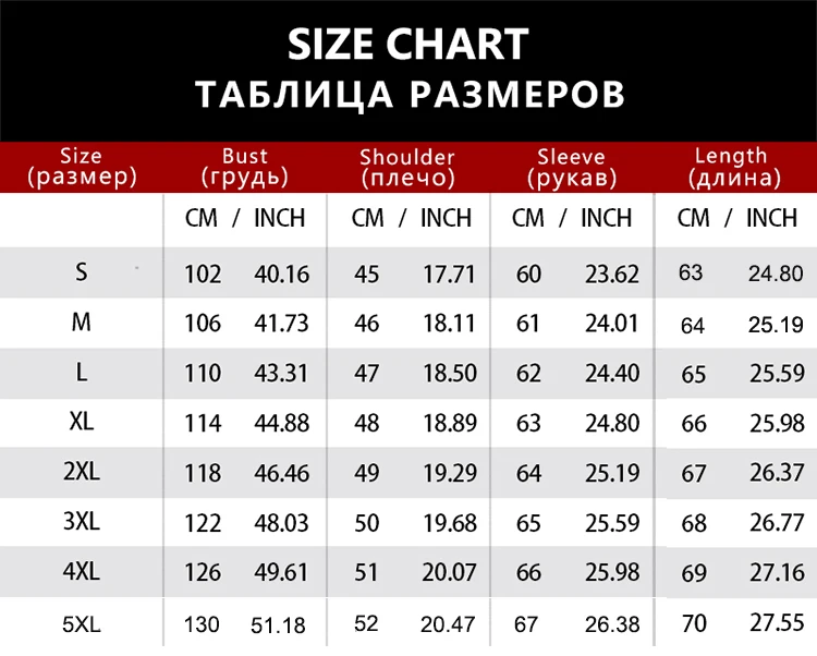 •All measurements above are actual garment measurements. For a good fit,please add 8cm~10cm to your body chest measurement when selecting your size from the table above.