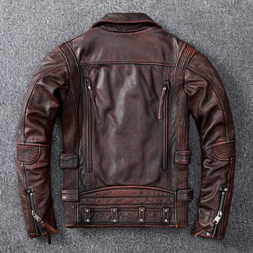 Black Motorcycle Leather Jacket Men Natural Genuine Cowhide Slim Fit Vintage Brown Mens Biker Racer Jackets Oblique Zipper S~9XL