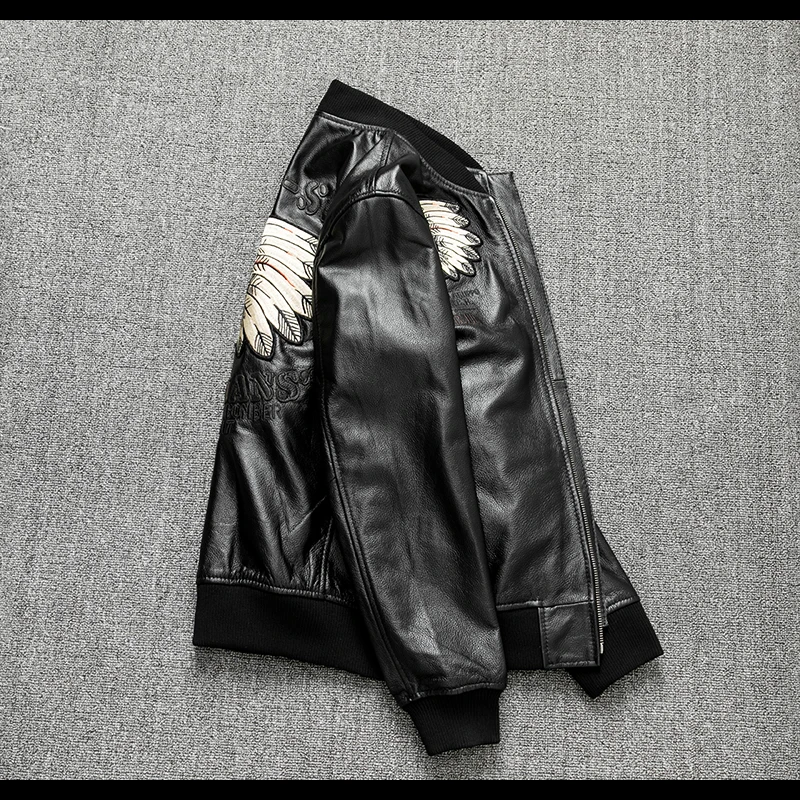 New Fashion Indian Embroidery Baseball Jacket Natural Genuine Leather Coat Men's Cowhide Leather Motorcycle Slim Jackets