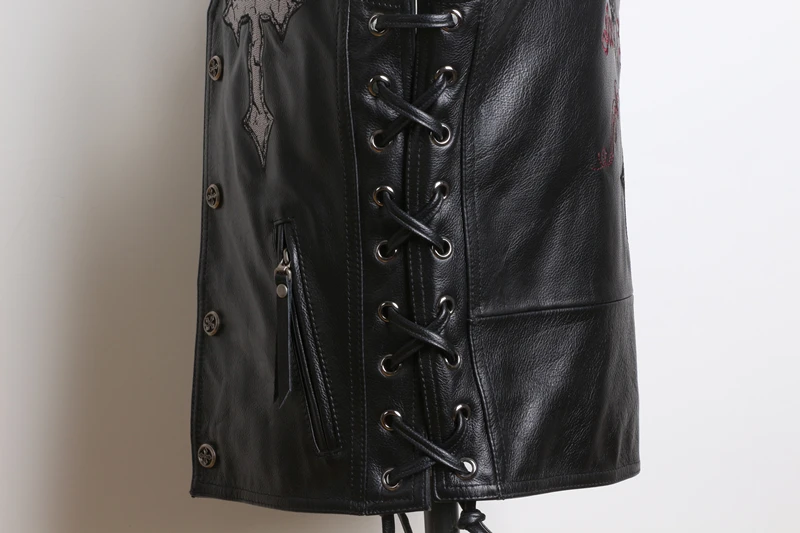 New Skull Embroidered Leather Waistcoat Men's Natural Cowhide Real Leather Slim Motor Vest Cross Motorcycle Biker Vest