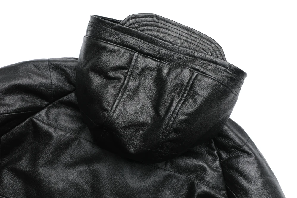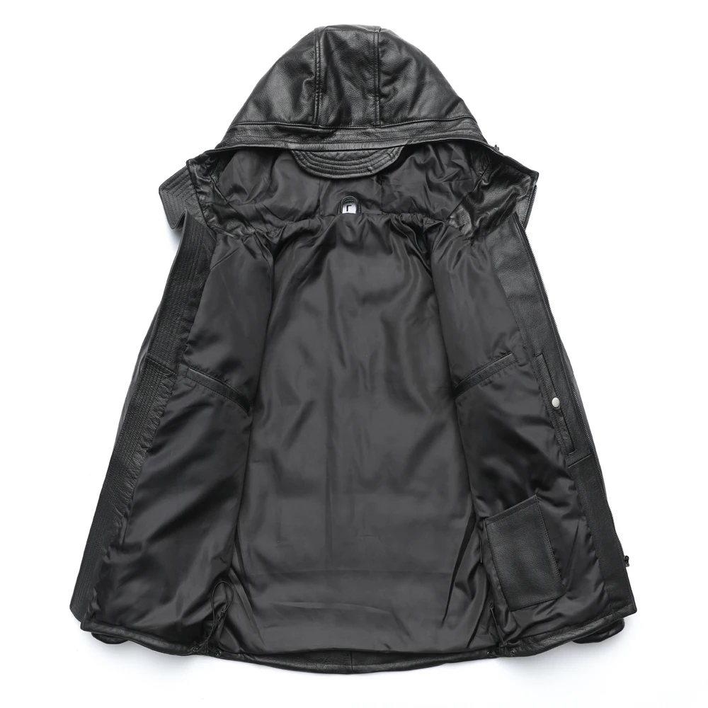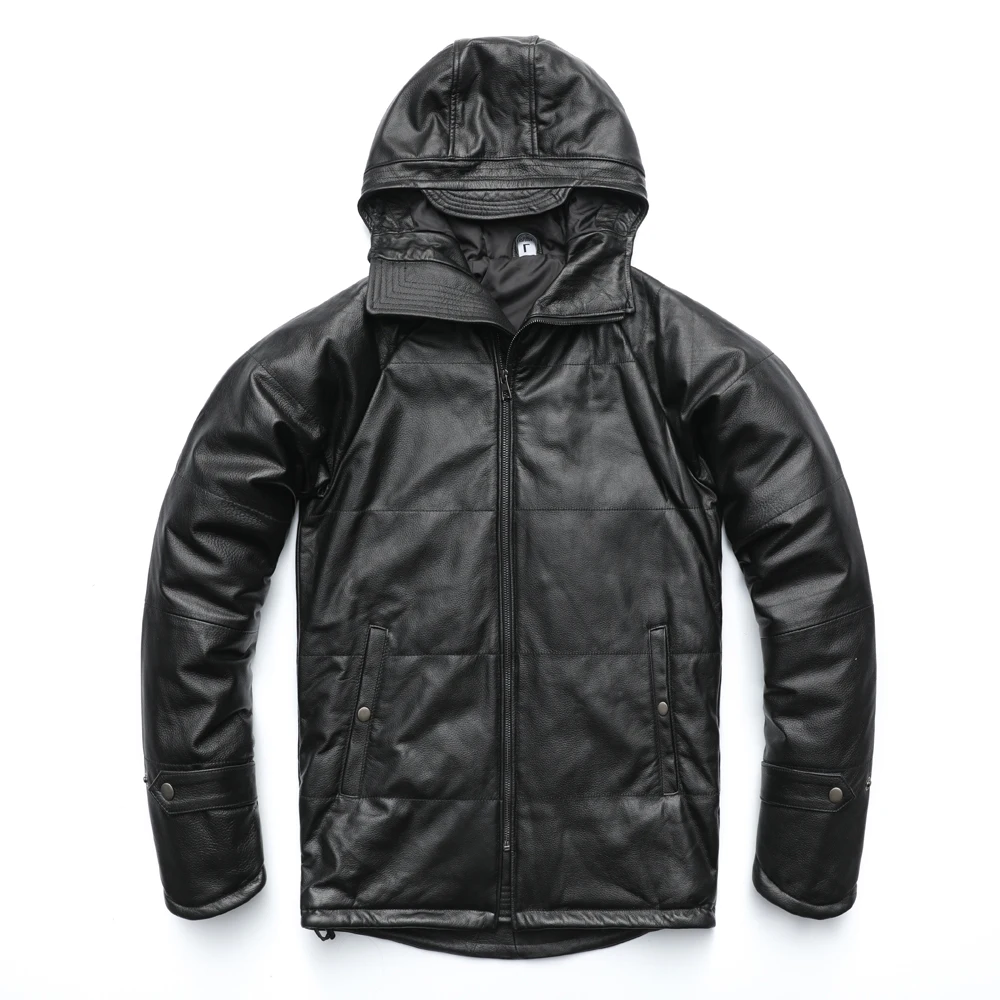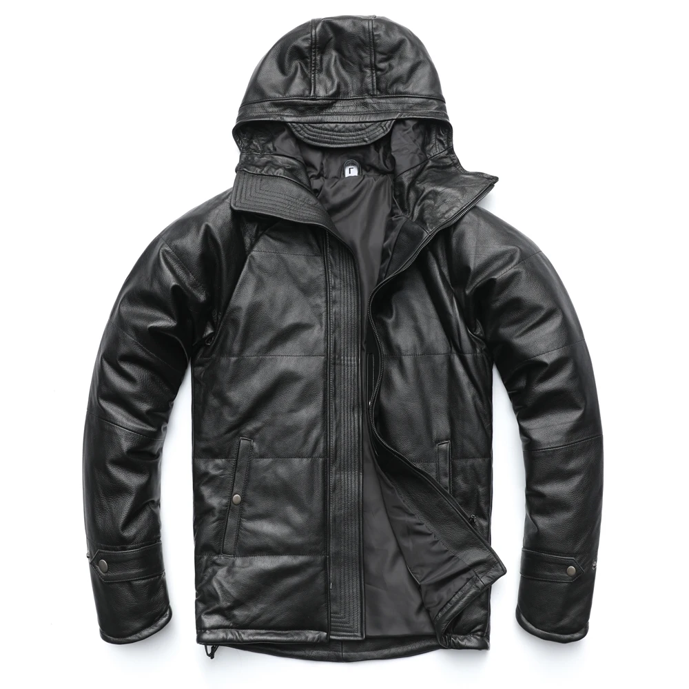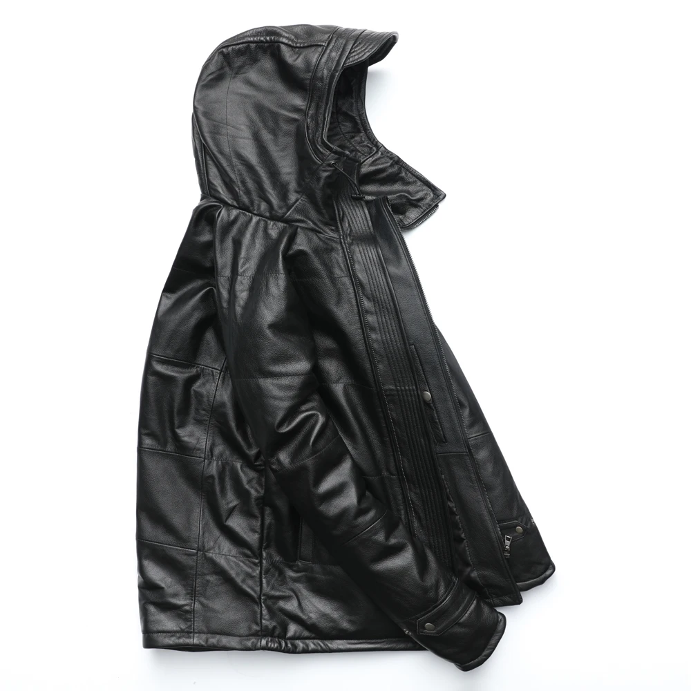Long Winter Coat Thick Warm Men Leather Coat Quilted Hood 100% Natural Cow Leather Coat Long Clothing Overcoat M490