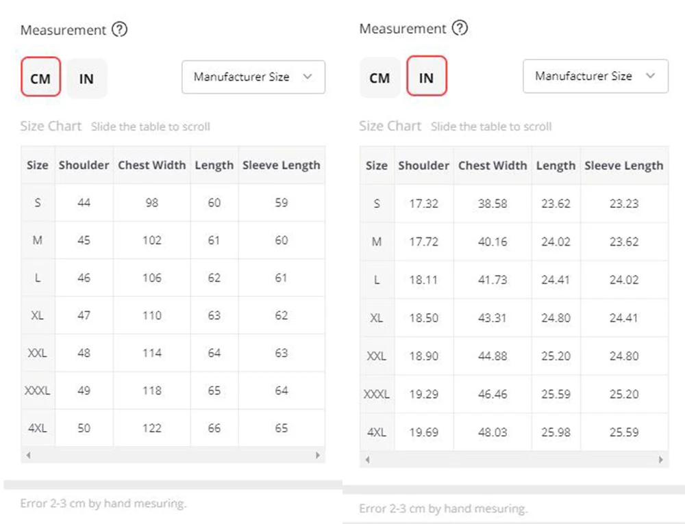 1. All measurements are in CM with 1-2cm measurment tolerance