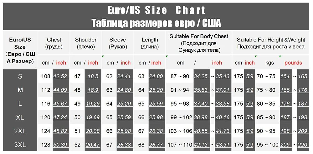 All measurements above are actual garment measurements. For a good fit,please add 8cm~10cm to your body chest measurement when selecting your size from the table above. Please ensure you measure yourself correctly before selecting your size to avoid errors.