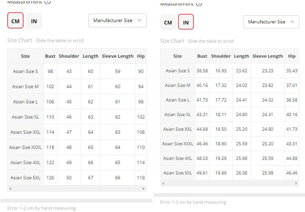 1. All measurements are in CM with 1-2cm measurment tolerance