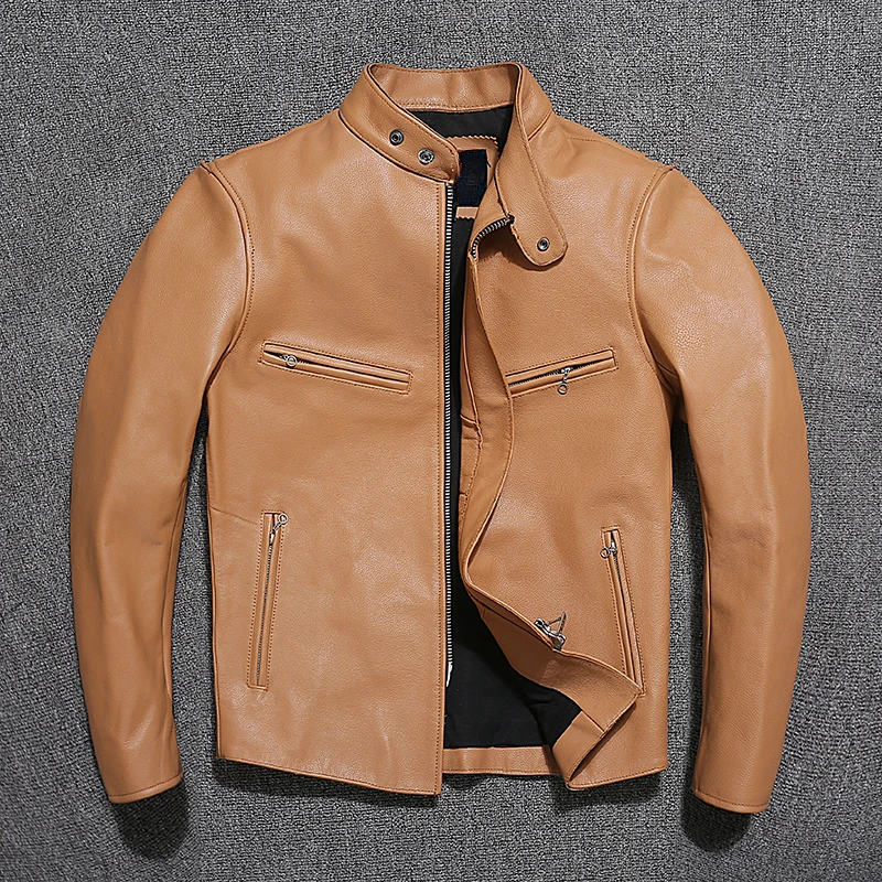 Slim Fit Mens Leather Jackets Light Yellow Real Cowhide Genuine Leather Jacket Men Autumn Jackets Male Skin Coats