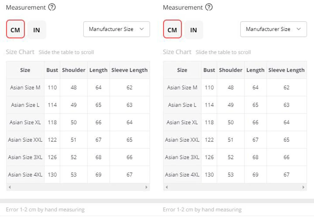 All measurements above are actual garment measurements. For a good fit,please add 8cm~10cm to your body chest measurement when selecting your size from the table above. Please ensure you measure yourself correctly before selecting your size to avoid errors.