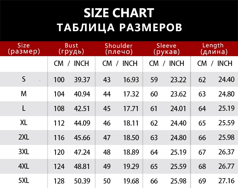 •All measurements above are actual garment measurements. For a good fit,please add 8cm~10cm to your body chest measurement when selecting your size from the table above.