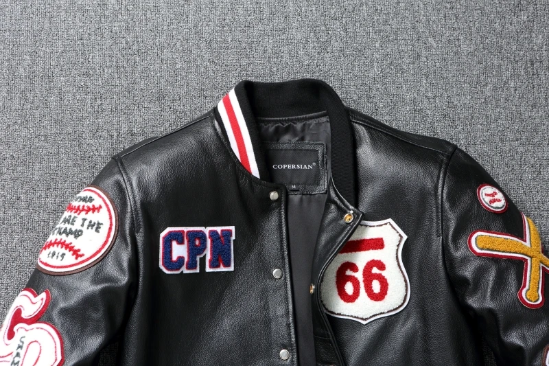 Embroidery Patches Baseball Jackets Genuine Cowhide Leather Jacket Men Motorcycle Biker Coats Autumn Mens Coat