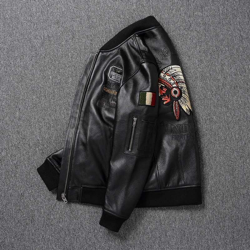Indian Embroidery Baseball Coat Genuine Cowhide Casual Leather Jackets for Men Leather Jacket Spring Autumn