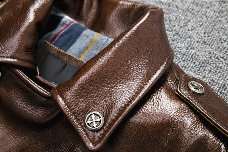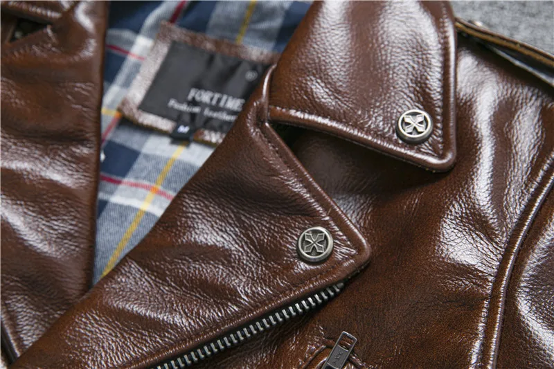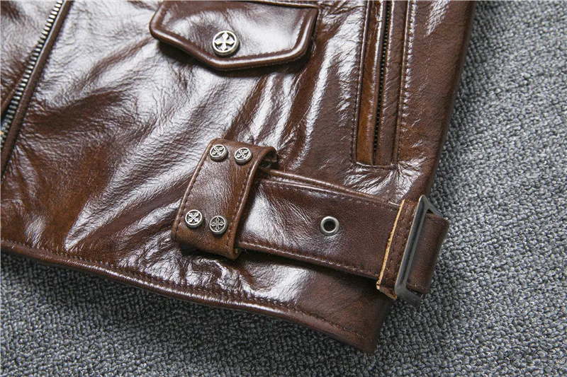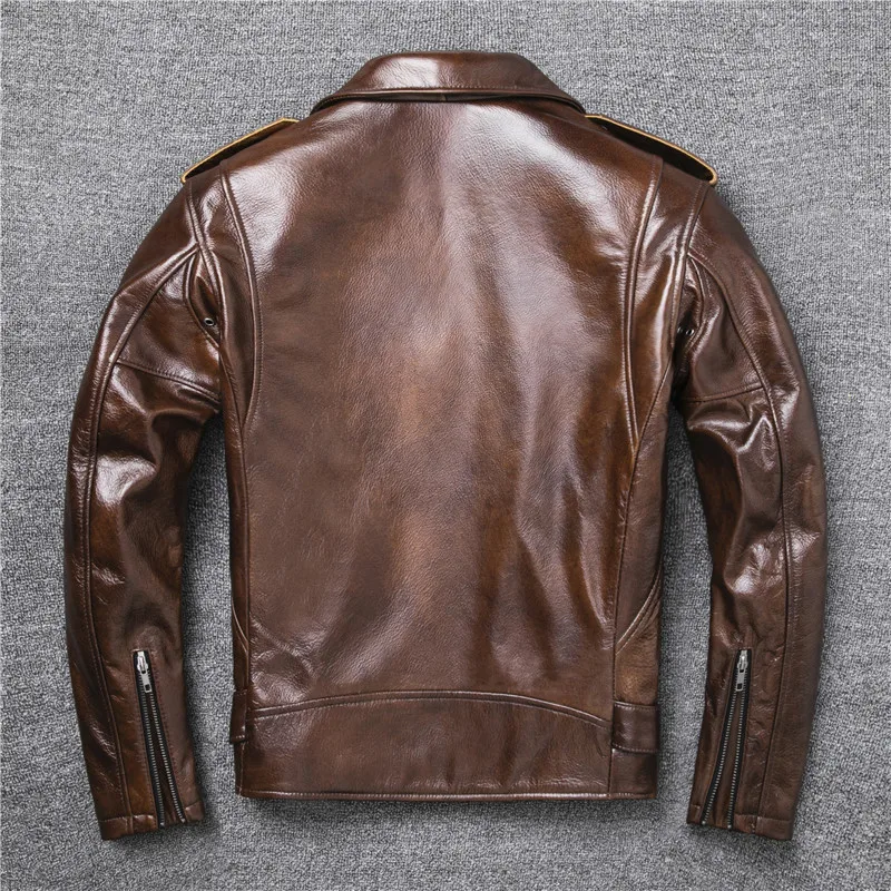 New Natural Oil Wax Calf Skin Jackets Men's Vintage Yellow Brown Leather Jacket Thick Turn Cowhide Slim Coats