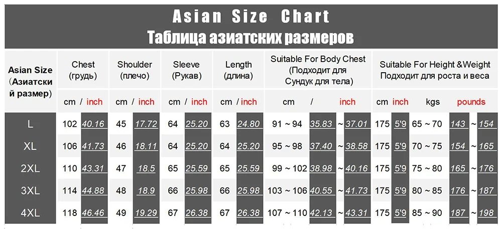 All measurements above are actual garment measurements. For a good fit,pleaseadd 8cm~10cm to your body chestmeasurement when selecting your size from the table above. Please ensure you measure yourself correctly before selecting your size to avoid errors.