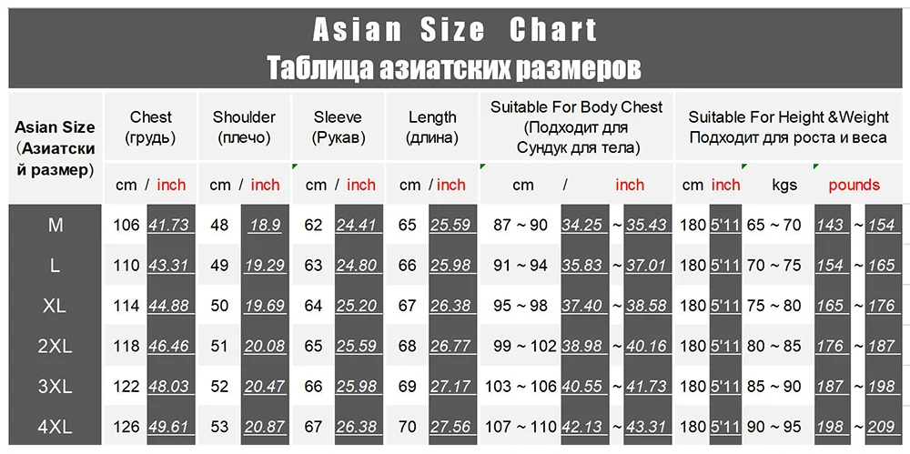 All measurements above are actual garment measurements. For a good fit,please add 8cm~10cm to your body chest measurement when selecting your size from the table above. Please ensure you measure yourself correctly before selecting your size to avoid errors.