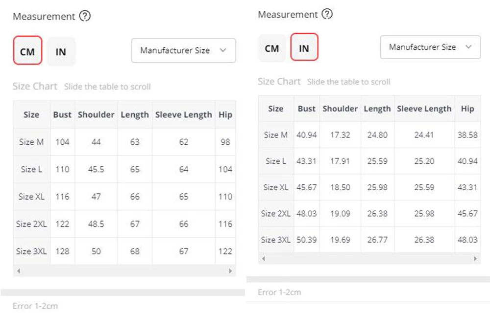 1. All measurements are in CM with 1-2cm measurment tolerance
