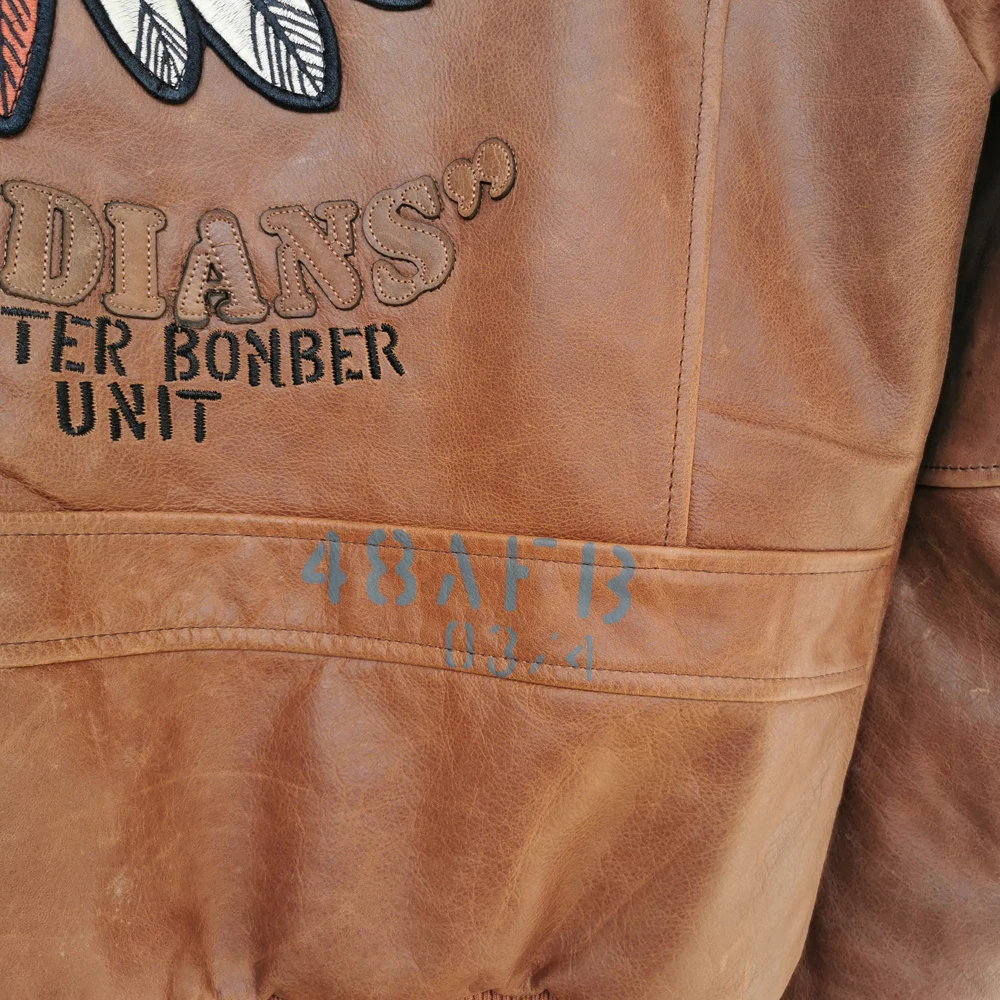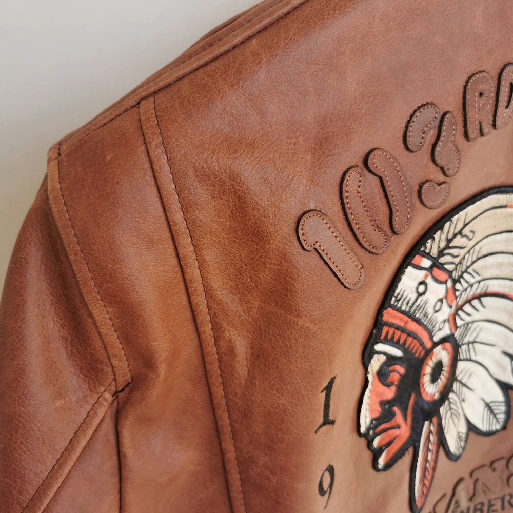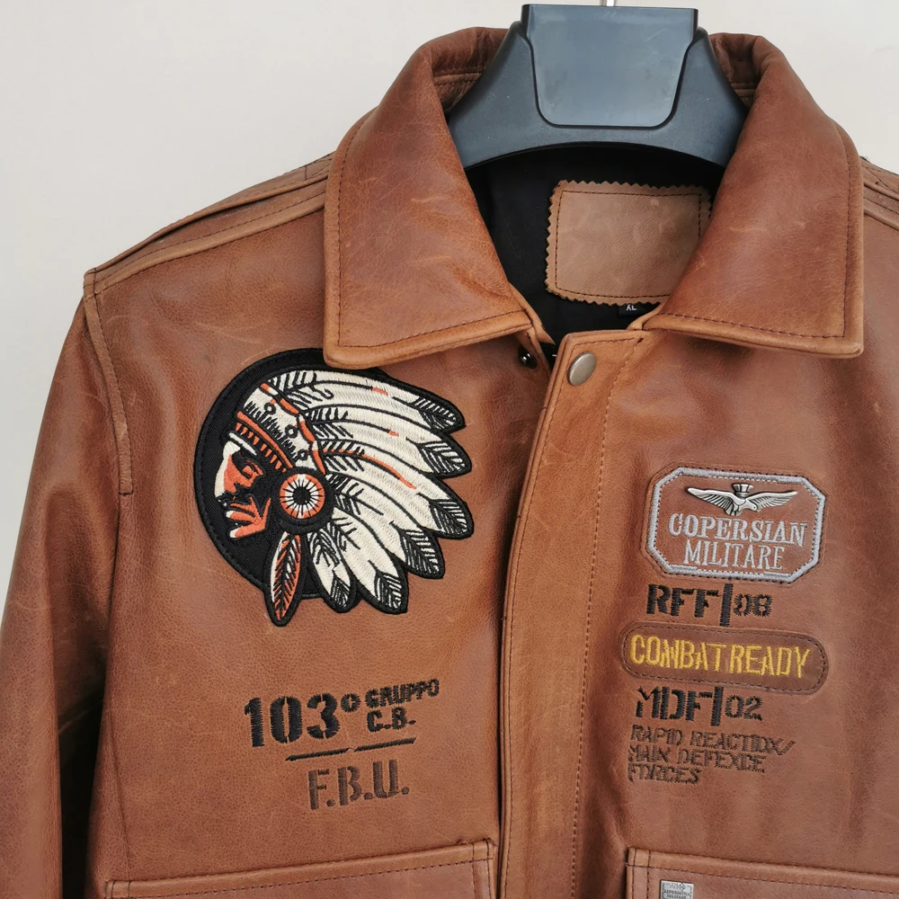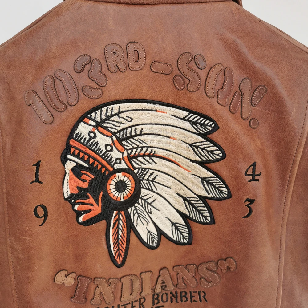 Indian Embroidery Bomber Flight Jackets Natural Genuine Leather Coat Men Cowhide Motorcycle Biker Jackets Fashion Clothing M600