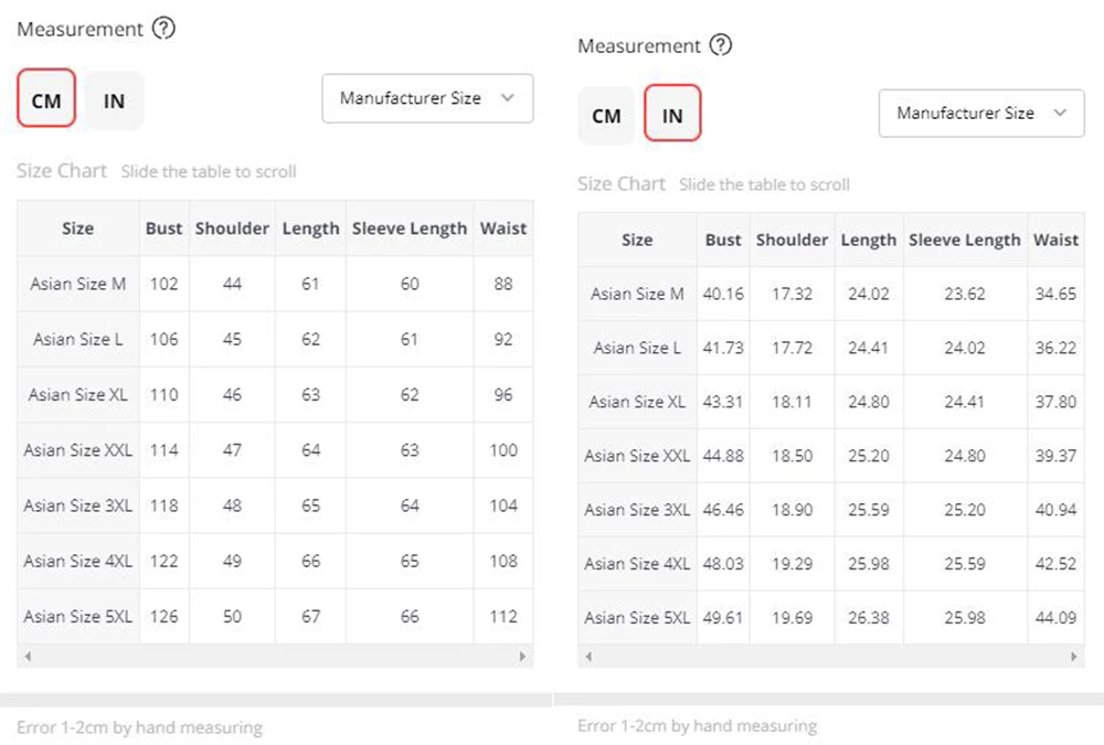 1. All measurements are in CM with 1-2cm measurment tolerance