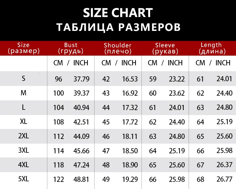 •All measurements above are actual garment measurements. For a good fit,please add 8cm~10cm to your body chest measurement when selecting your size from the table above.