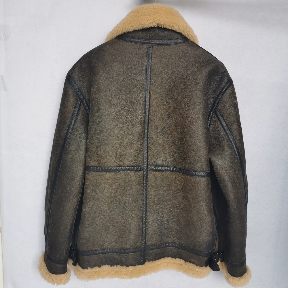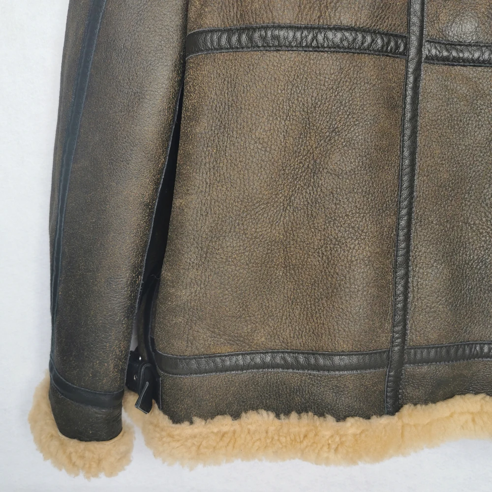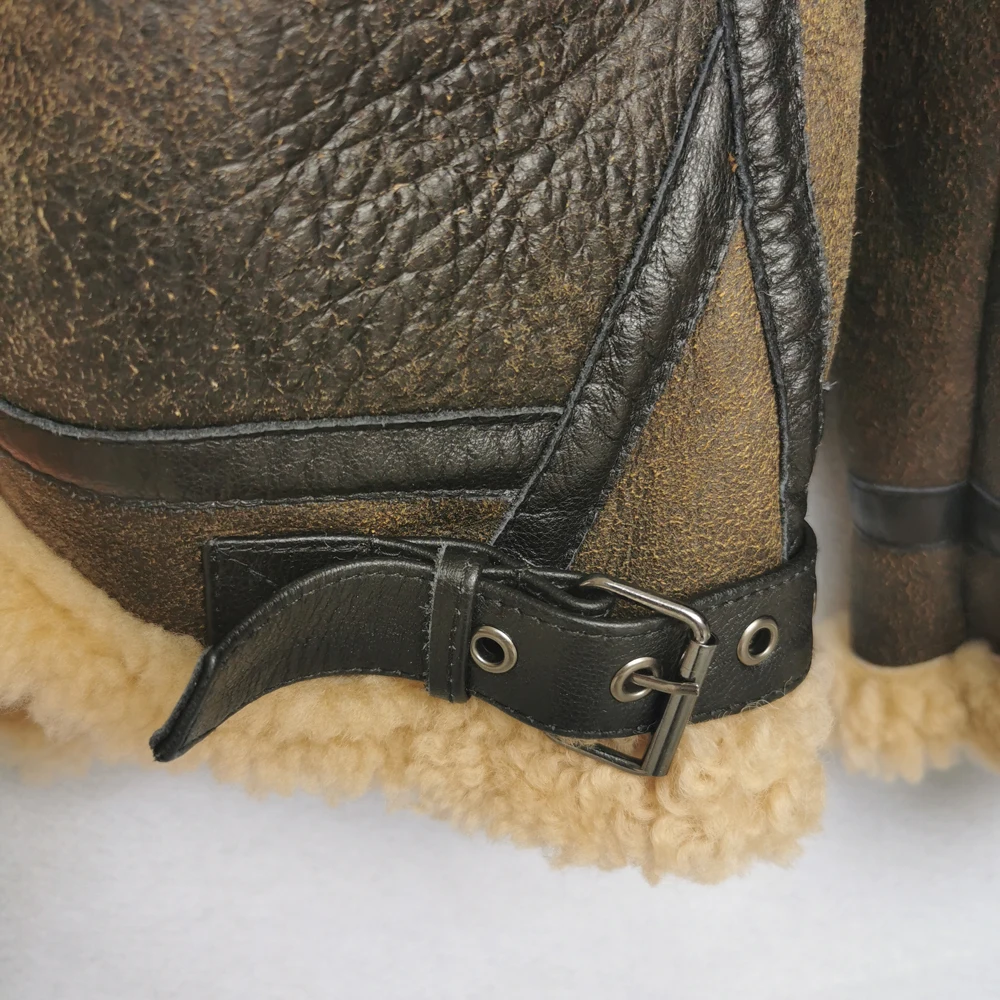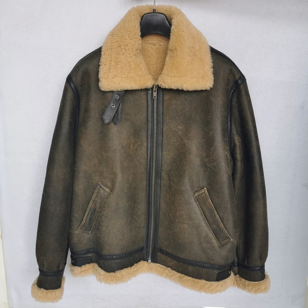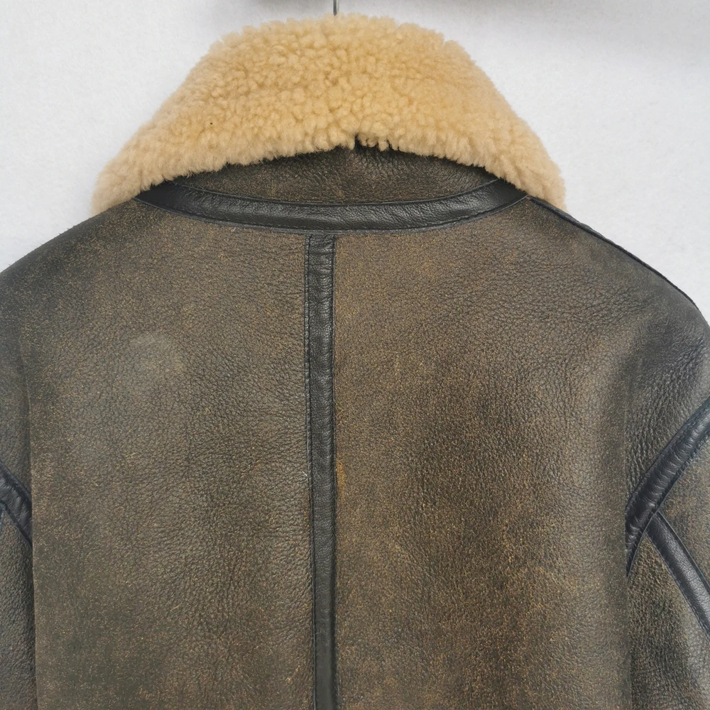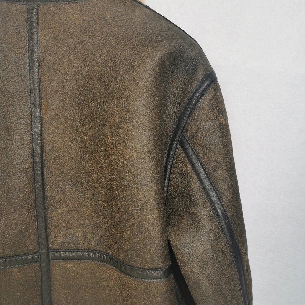 Thick Brown Cracking Leather Shearling Coat Men 100% Natural Sheepskin Fur Coat Winter Man Leather Coat Warm Clothing M372