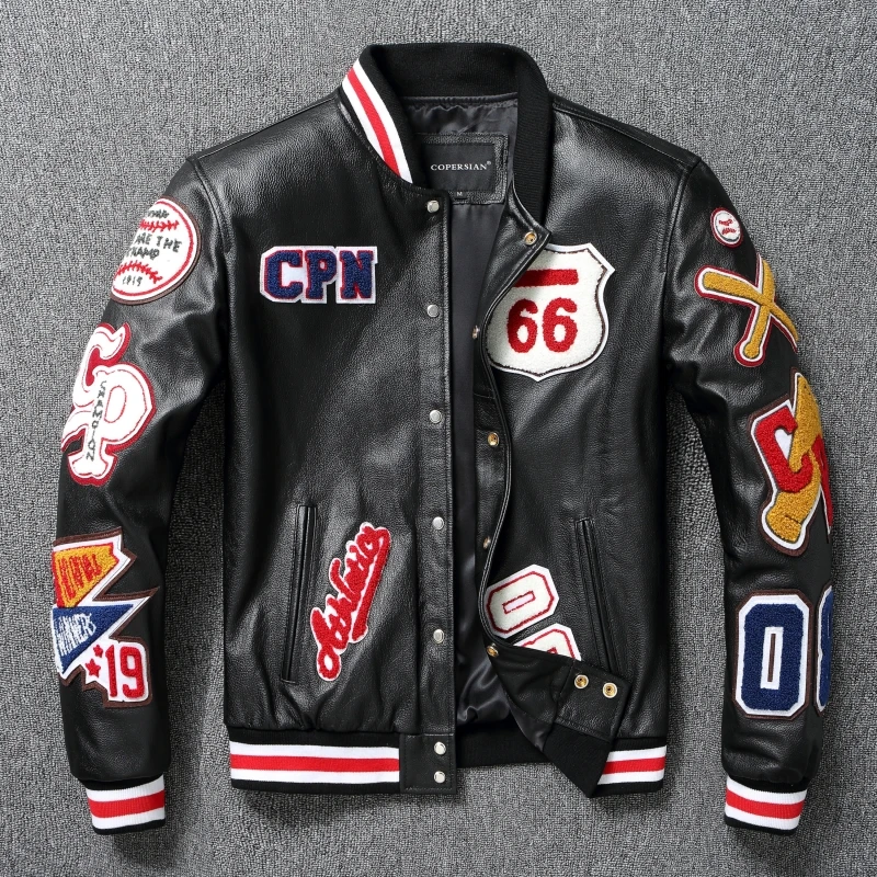 Embroidery Patches Baseball Jackets Genuine Cowhide Leather Jacket Men Motorcycle Biker Coats Autumn Mens Coat