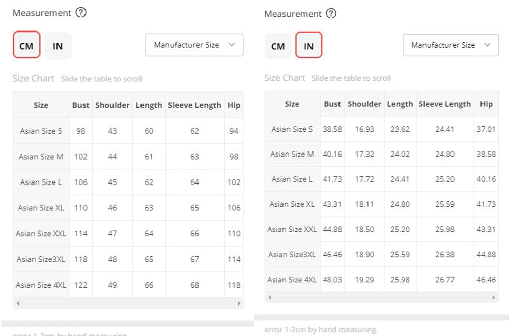 1. All measurements are in CM with 1-2cm measurment tolerance