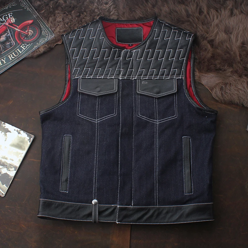 SOA Club Riding Biker Vests Motorcycle Leather Vest Men Real Cowhide Denim Patchwork Waistcoat Sons of Anarchy Sleeveless Jacket