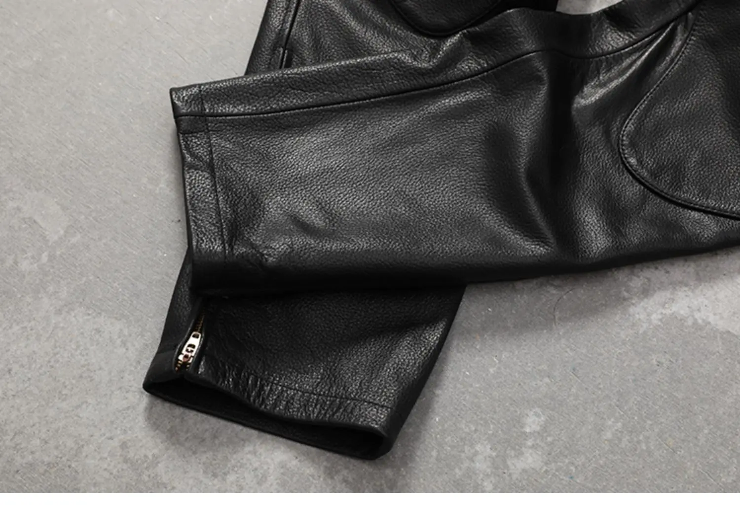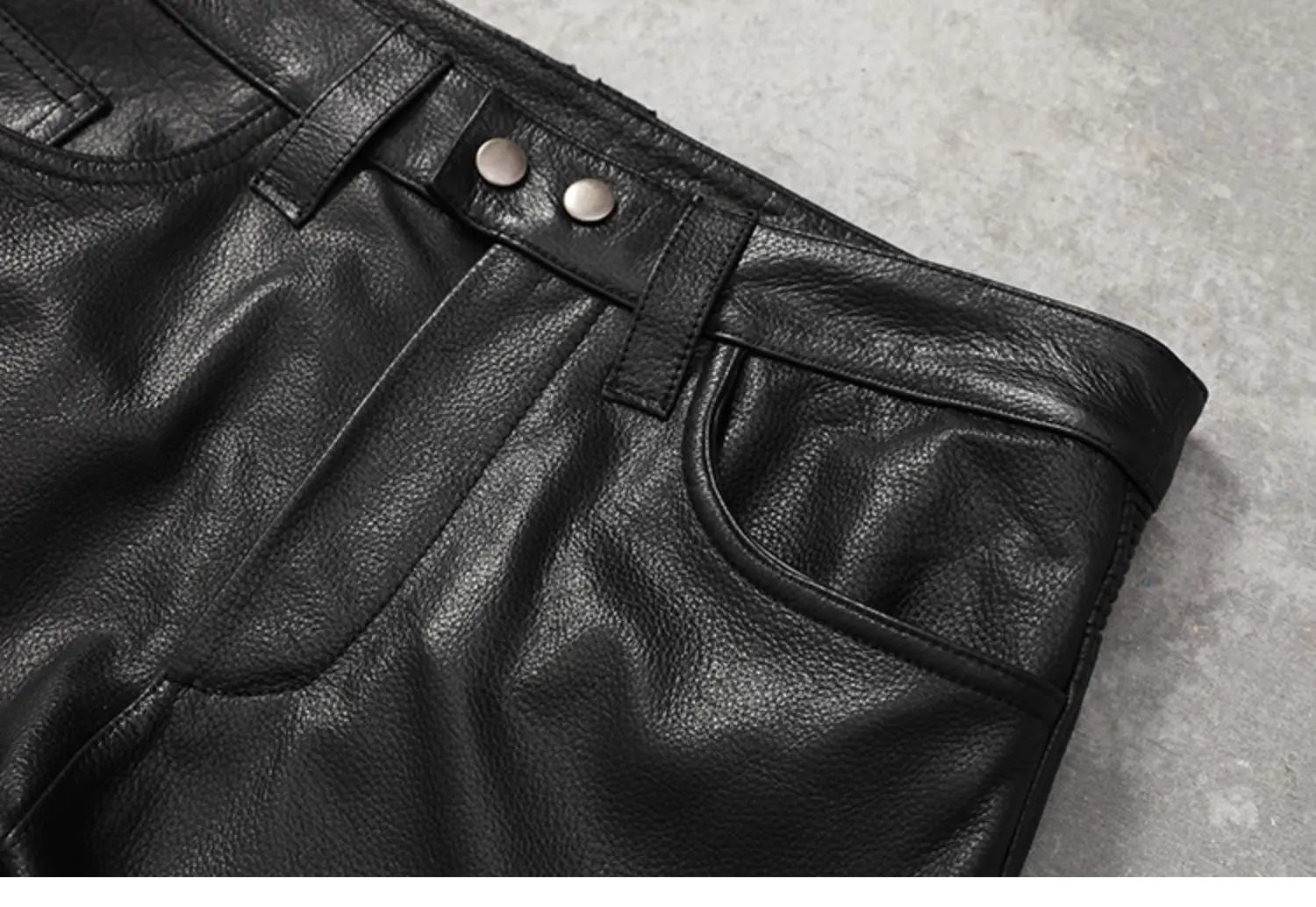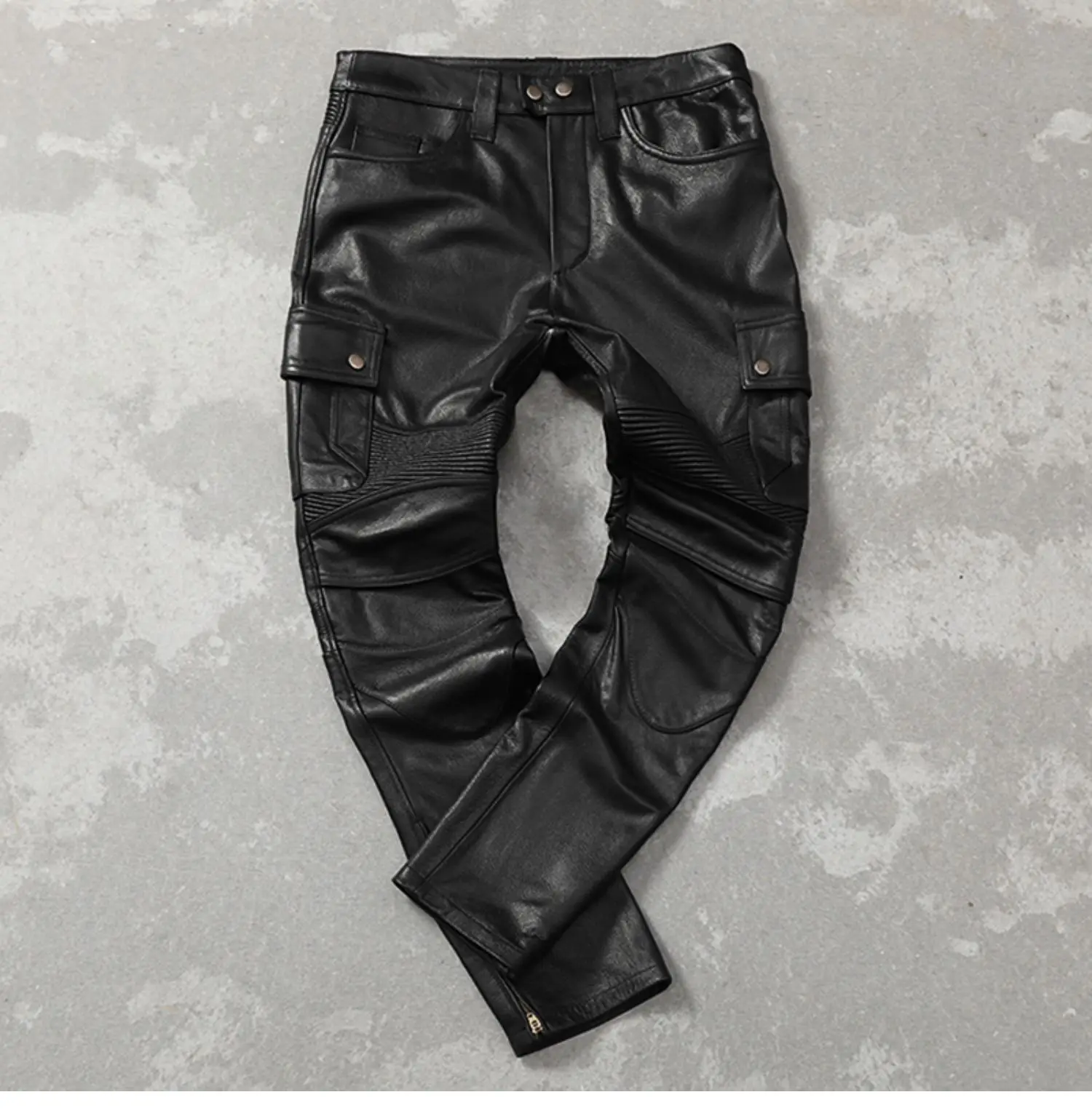 Black Motorcycle Pant Men's Cowhide Genuine Leather Trousers Men Moto Biker Slim Pants with Knee Protectors Pantalon Cuir Homme