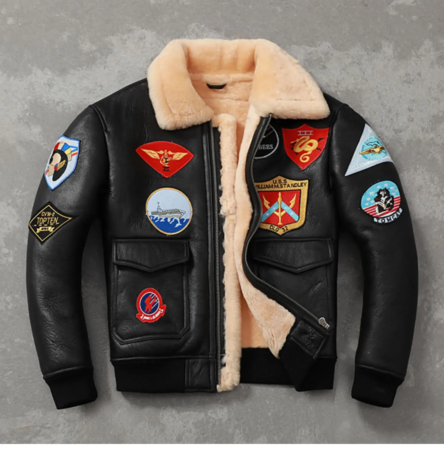 Natural Sheepskin Fur Men Shearling Coat Thick Warm 17 Patches G1 Flight Jackets Winter Aviator Coat Men Leather Jacket 가죽점퍼