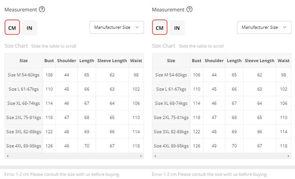 All measurements above are actual garment measurements. For a good fit,please add 14 cm~16cm to your body chest measurement when selecting your size from the table above. Please ensure you measure yourself correctly before selecting your size to avoid errors.