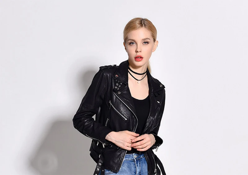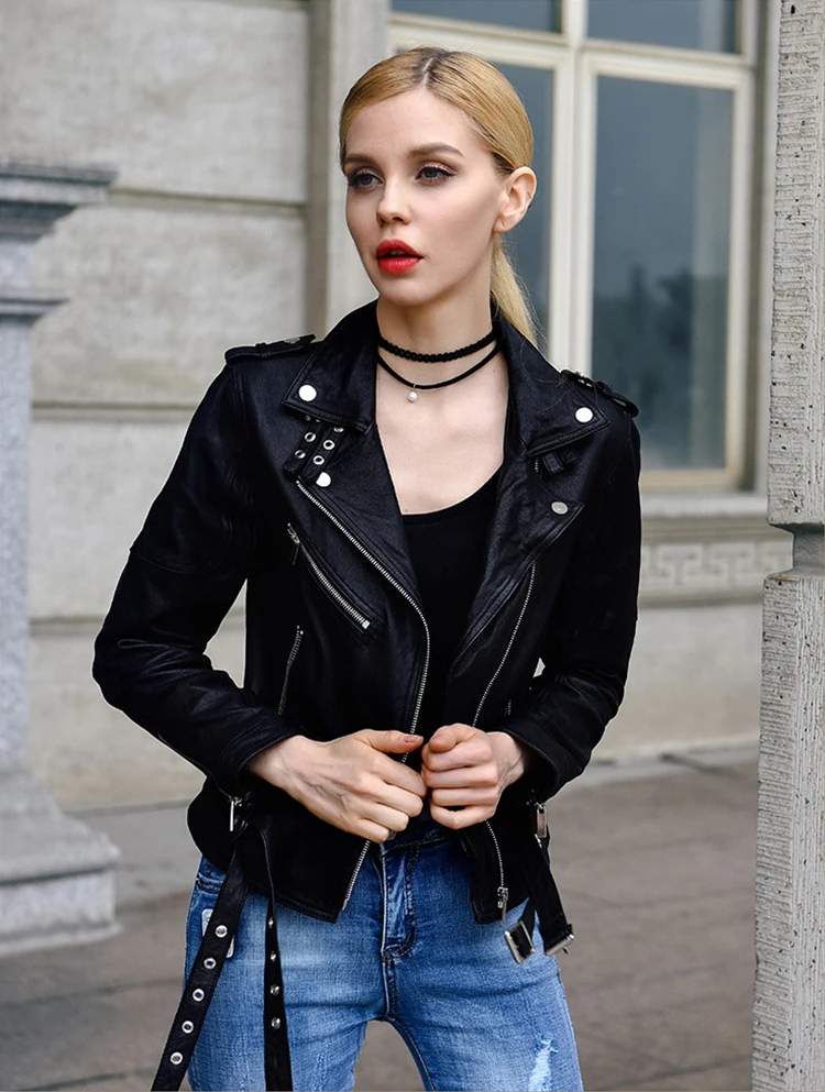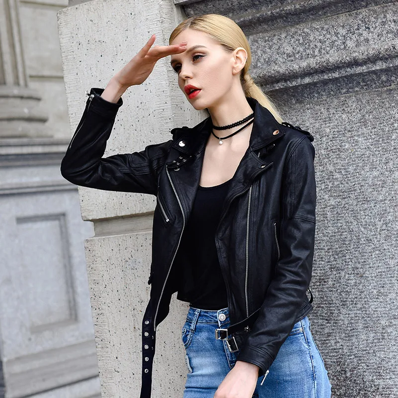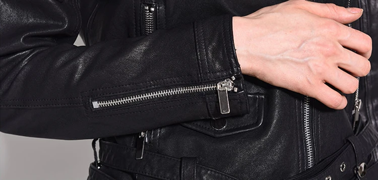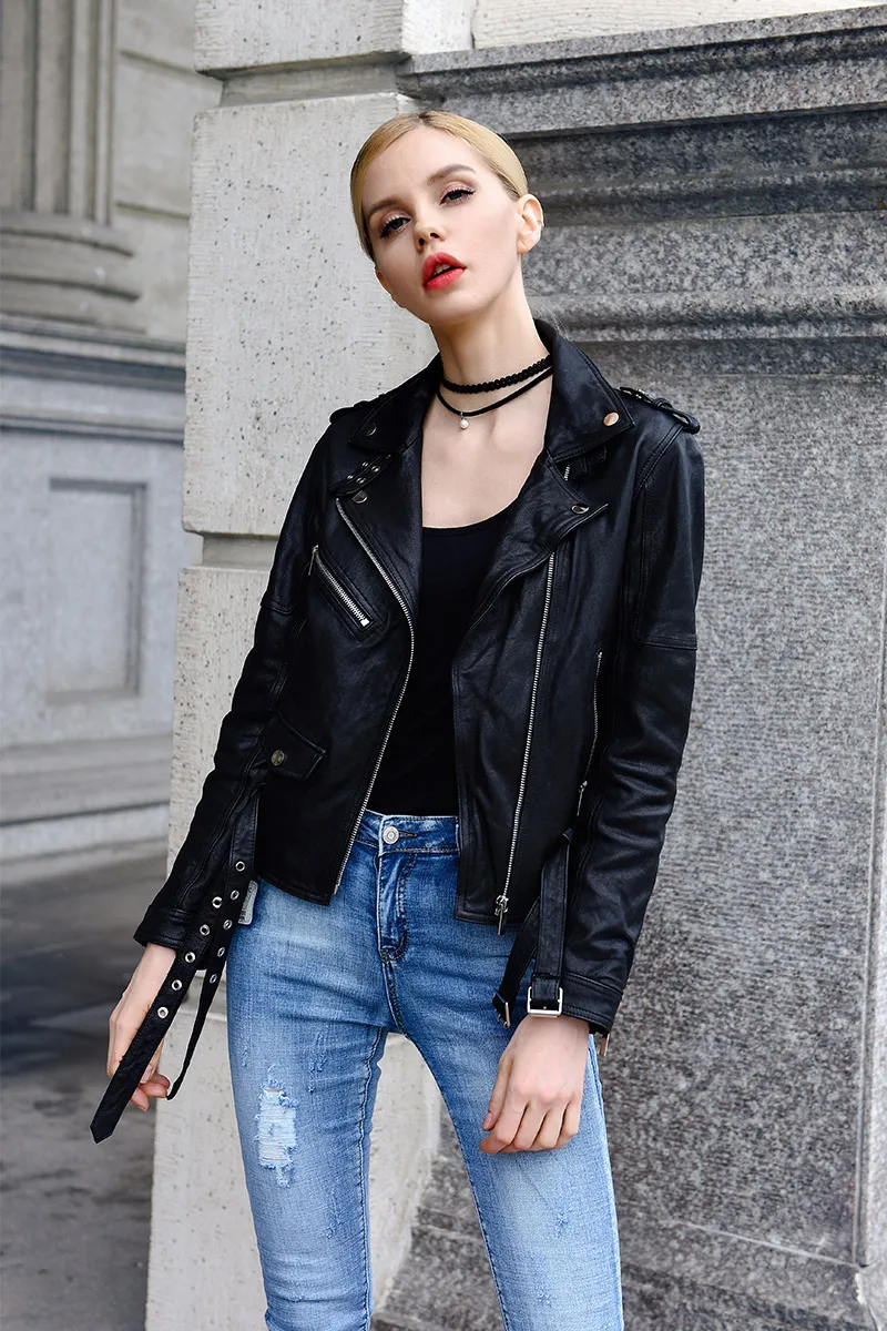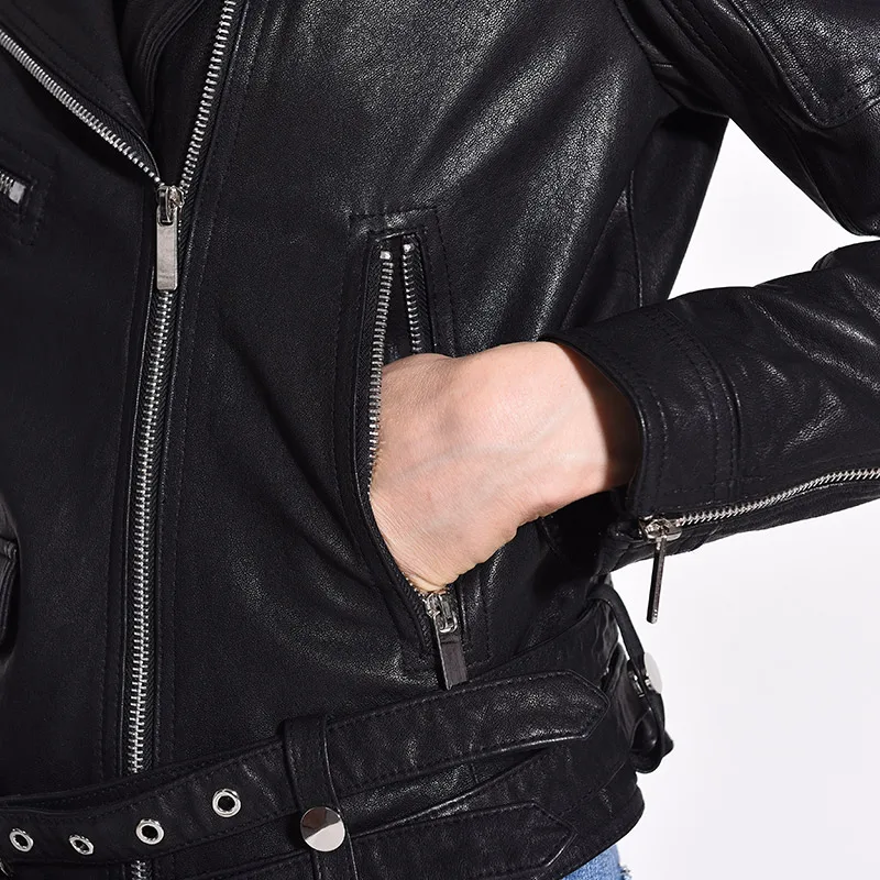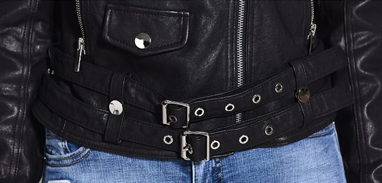 Women Genuine Leather Jacket Soft 100% Tanned Sheepskin Double Belts Female Leather Coat Ladies Biker Clothing Autumn M307