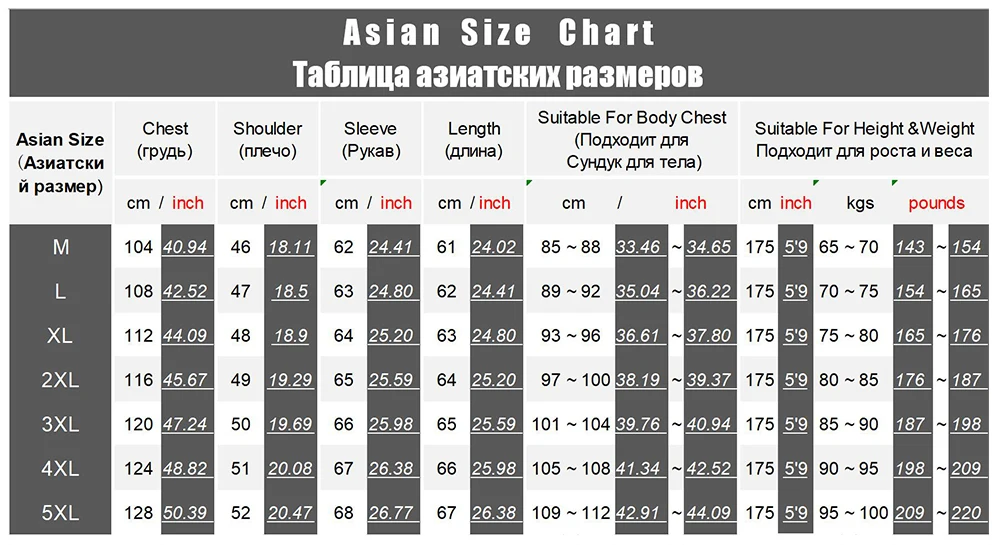 All measurements above are actual garment measurements. For a good fit,please add 8cm~10cm to your body chest measurement when selecting your size from the table above. Please ensure you measure yourself correctly before selecting your size to avoid errors.