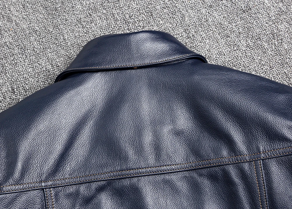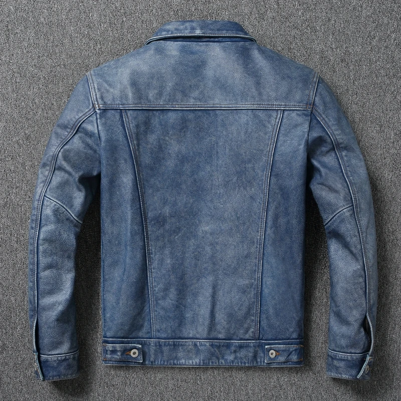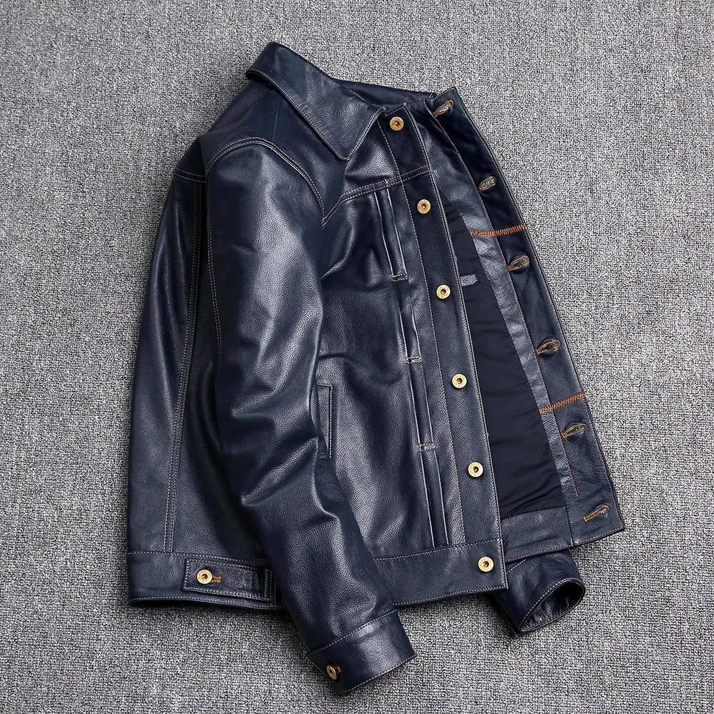 Vintage Blue Men Leather Jacket Genuine Cowhide Short Coat Slim Lapel Work Clothes Natural Calf Skin Jackets