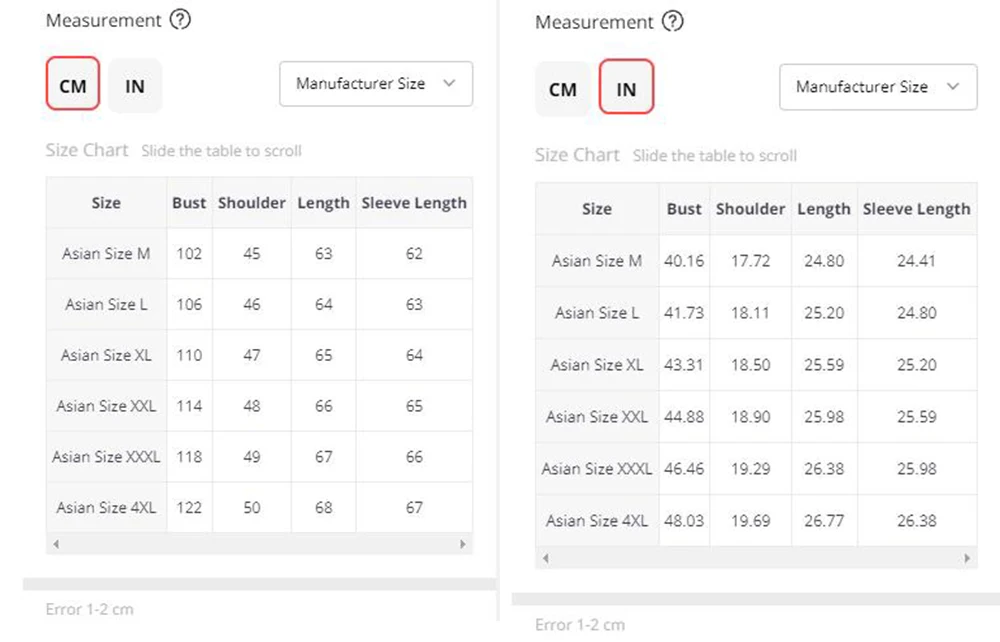 1. All measurements are in CM with 1-2cm measurment tolerance