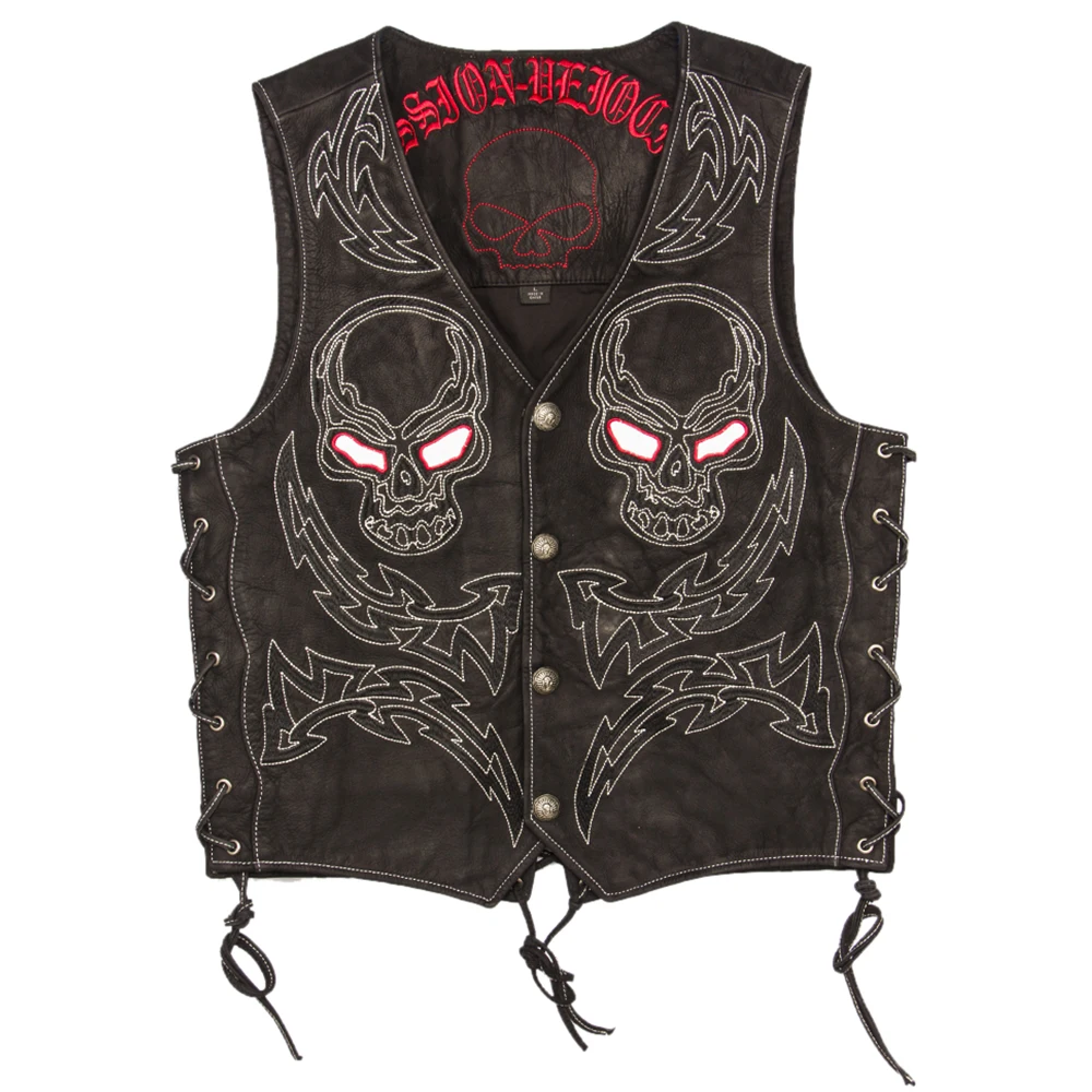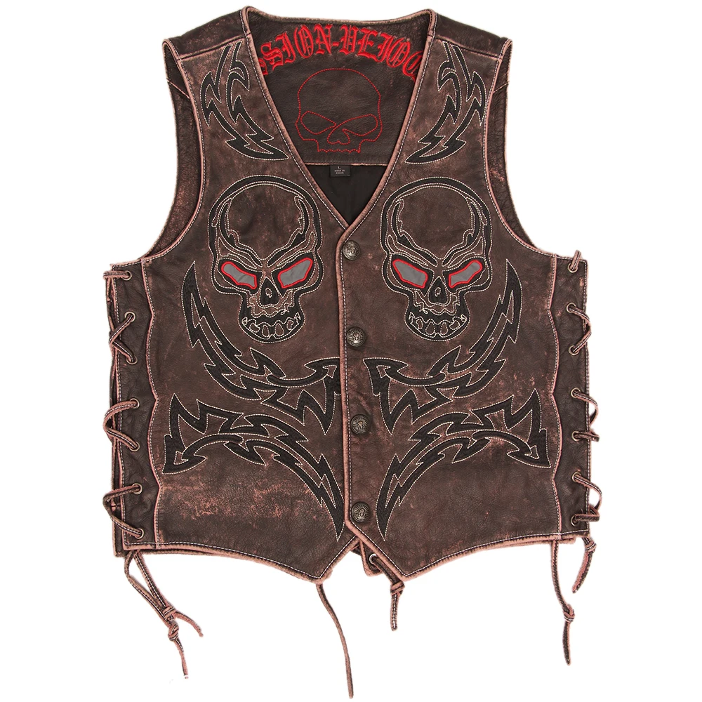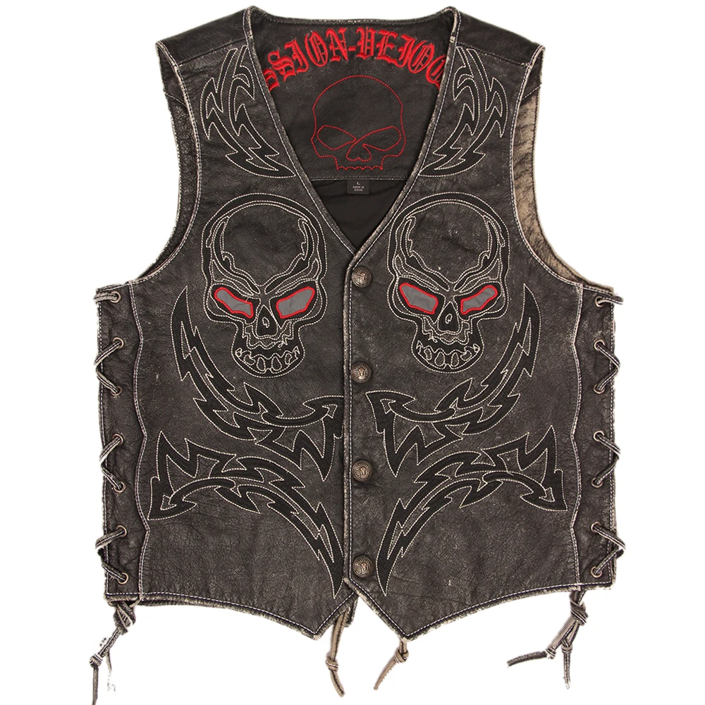 Vintage Skulls Embroidery Motorcycle Leather Vest 100% Genuine Cowhide Short Men Biker Leather Vest Moto Leather Waistcoat M450