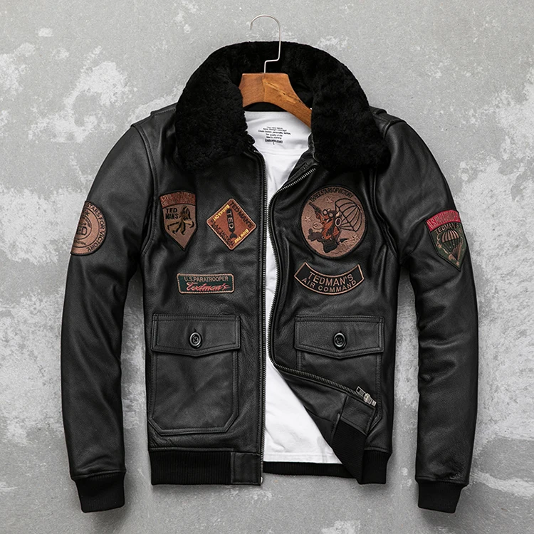Detachable Natural Fur Collar Genuine Cowhide Men Leather Jacket Patches Flight Jacket Air Force Pilot Coat Winter Bomber Jacket