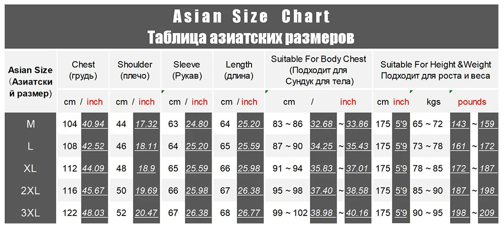 All measurements above are actual garment measurements. For a good fit,please add 8cm~10cm to your body chest measurement when selecting your size from the table above. Please ensure you measure yourself correctly before selecting your size to avoid errors.