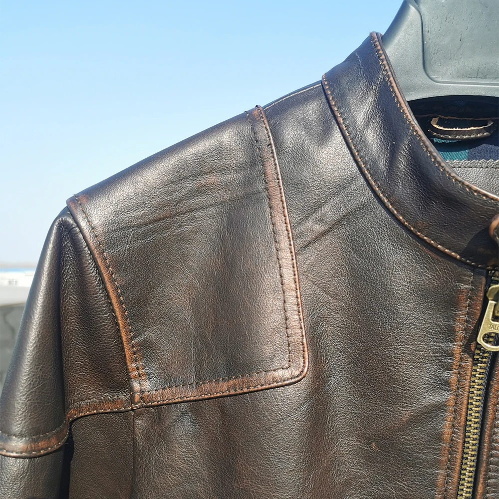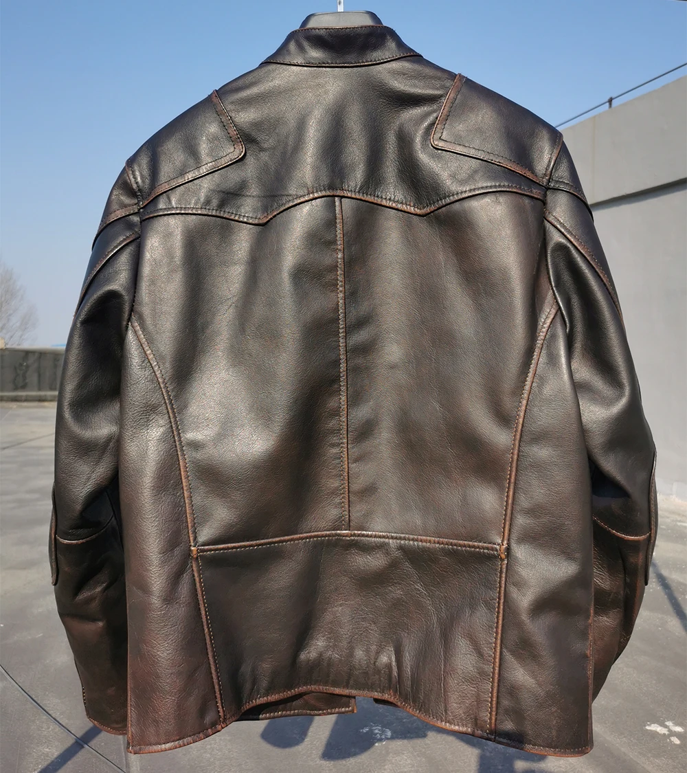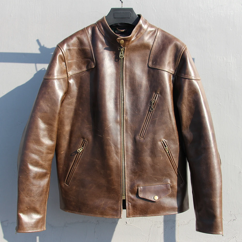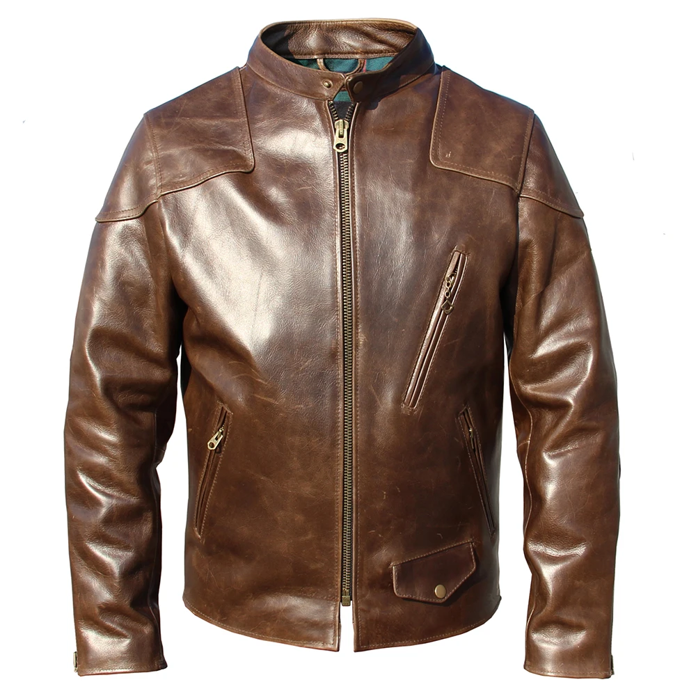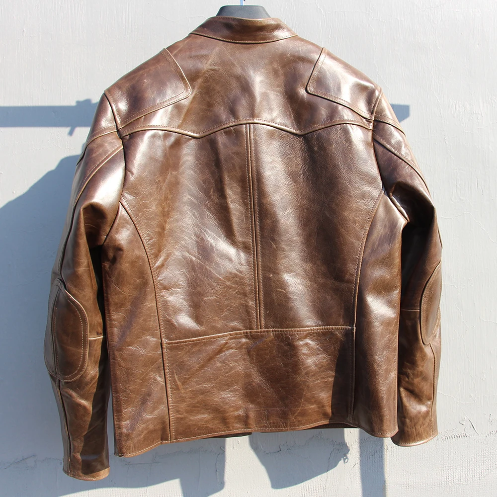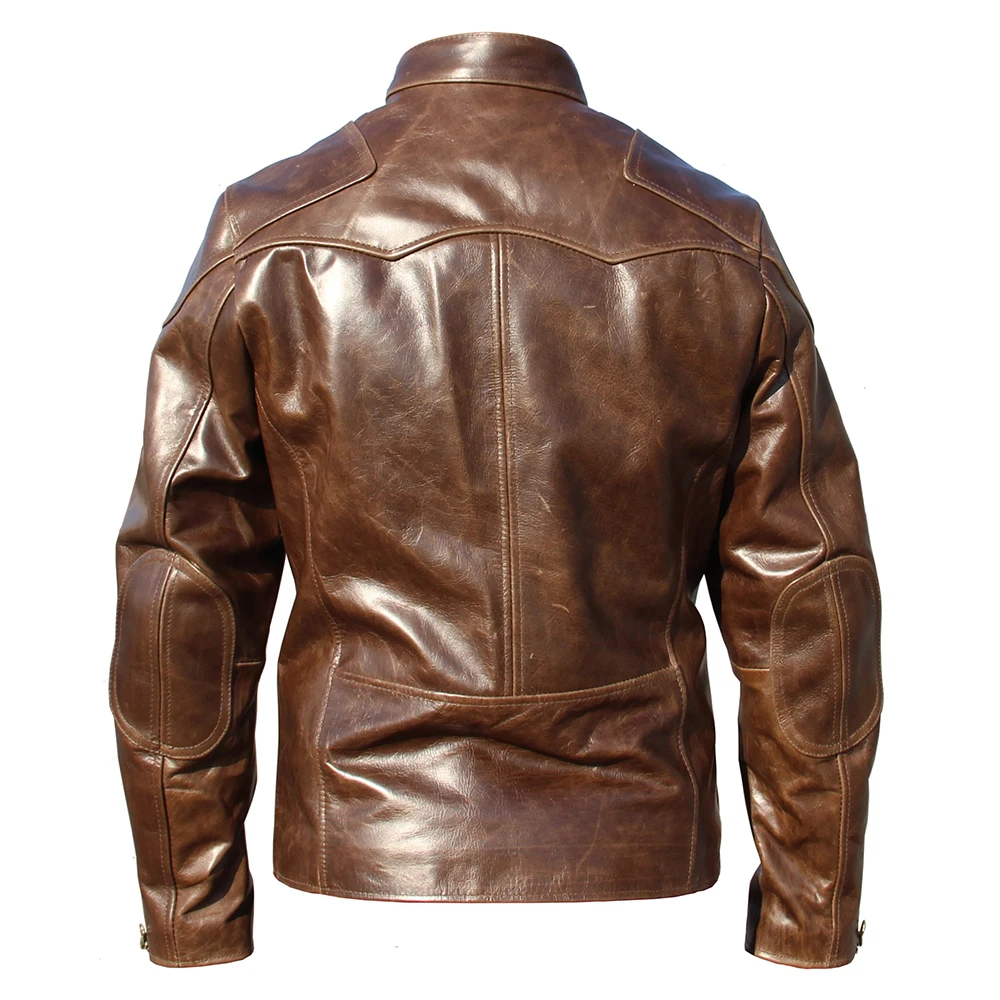Fashion Natural Horsehide Leather Jacket Men Oil Waxed Cowhide Genuine Leather Coat Slim Male Clothes Autumn Chest 128cm M002