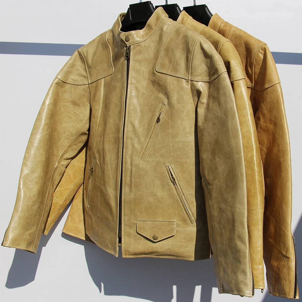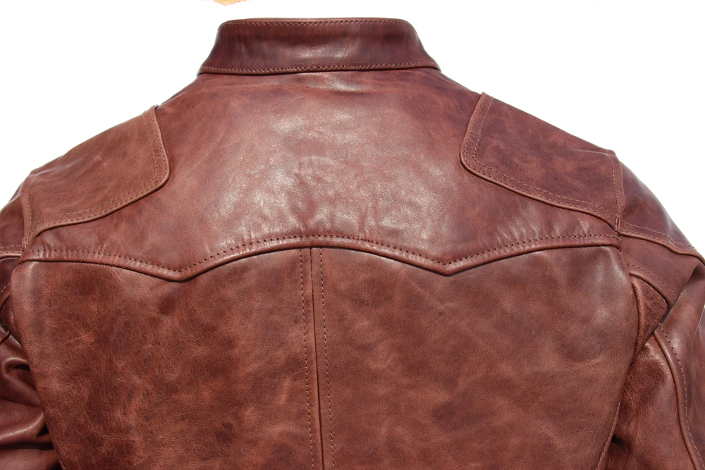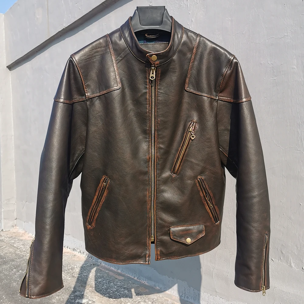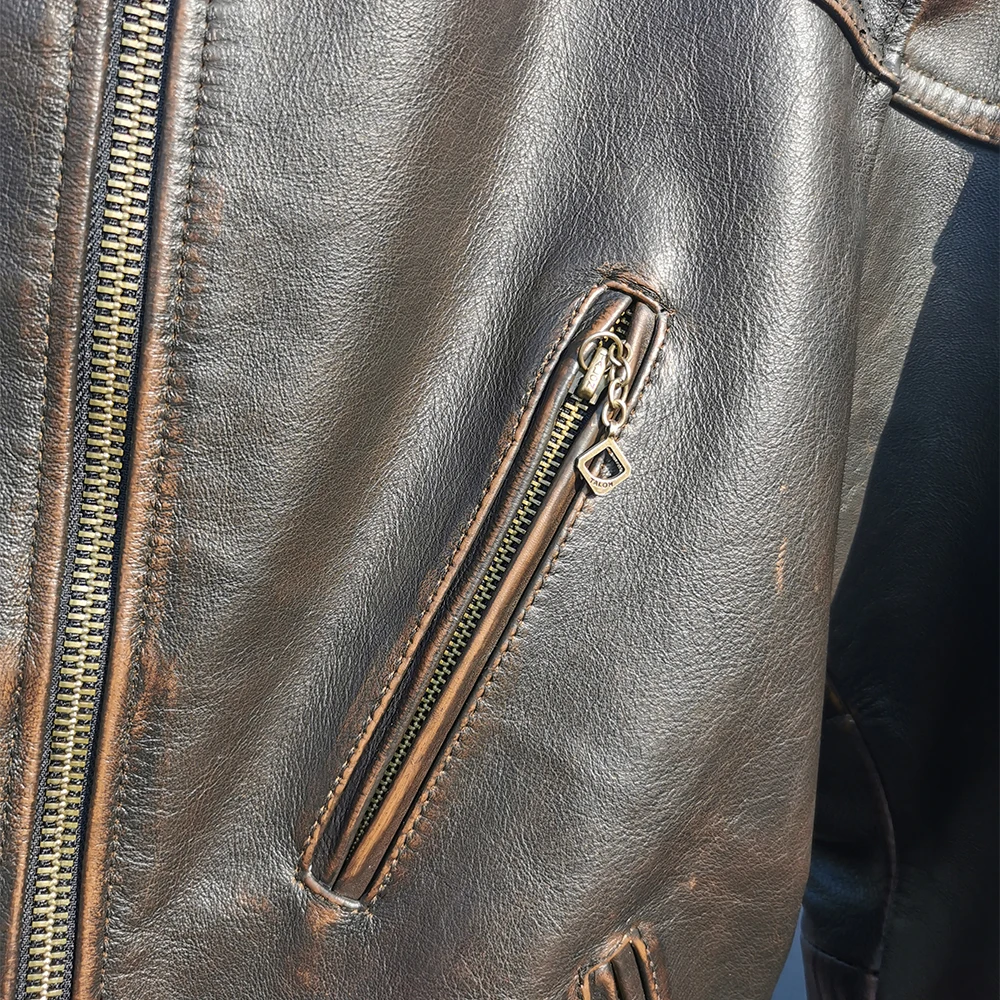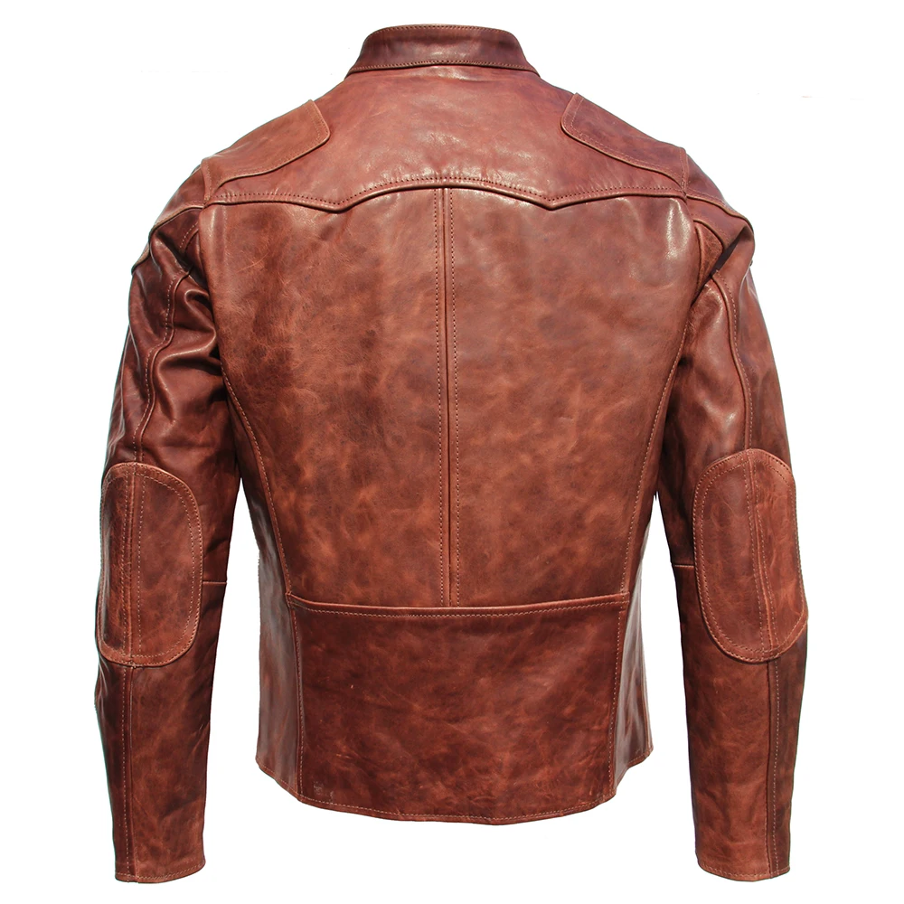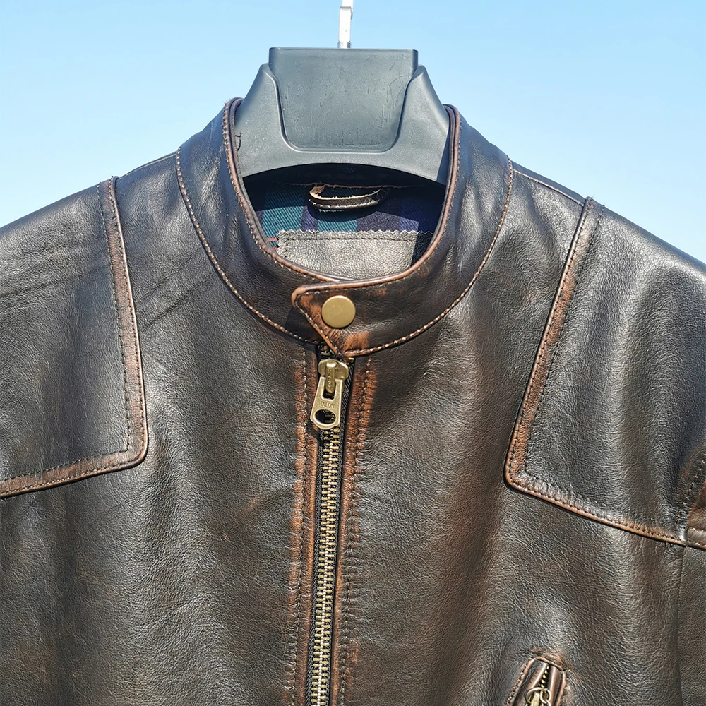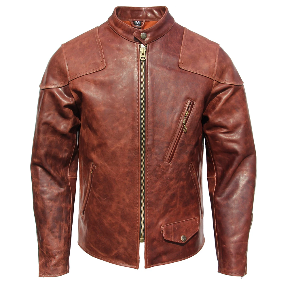 Fashion Natural Horsehide Leather Jacket Men Oil Waxed Cowhide Genuine Leather Coat Slim Male Clothes Autumn Chest 128cm M002