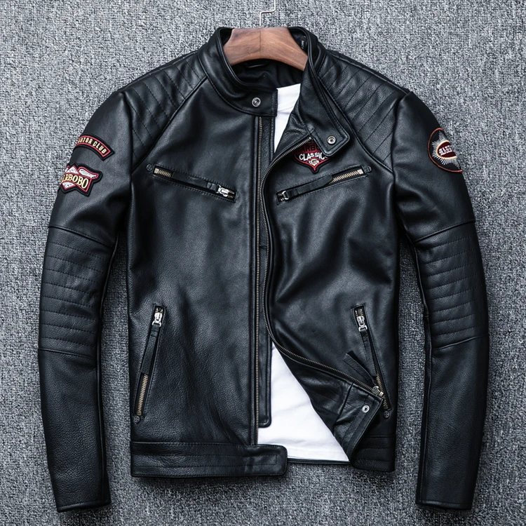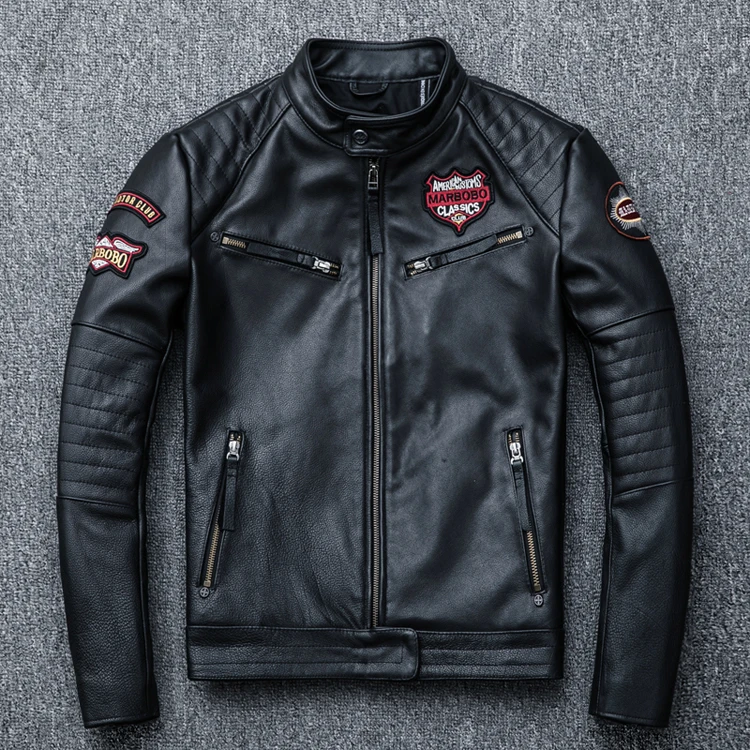 New Black Embroidery Skull Motorcycle Leather Jackets Natural Cowhide Motor Jacket Biker Leather Coat Slim Clothing Racer Coats
