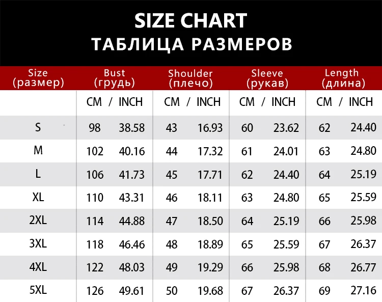 •All measurements above are actual garment measurements. For a good fit,please add 8cm~10cm to your body chest measurement when selecting your size from the table above.