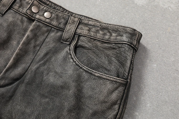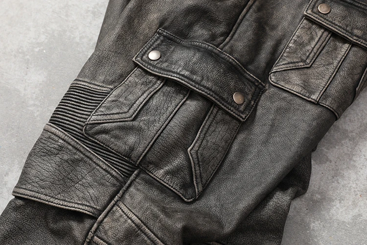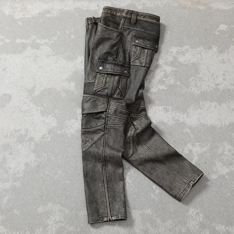 Vintage Gray Genuine Cowhide Leather Pants Men Motorcycle Biker Leather Trousers Autumn Winter Men Leather Pants Calca Masculina