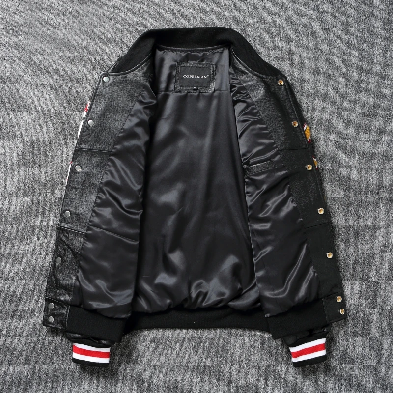 Embroidery Patches Baseball Jackets Genuine Cowhide Leather Jacket Men Motorcycle Biker Coats Autumn Mens Coat
