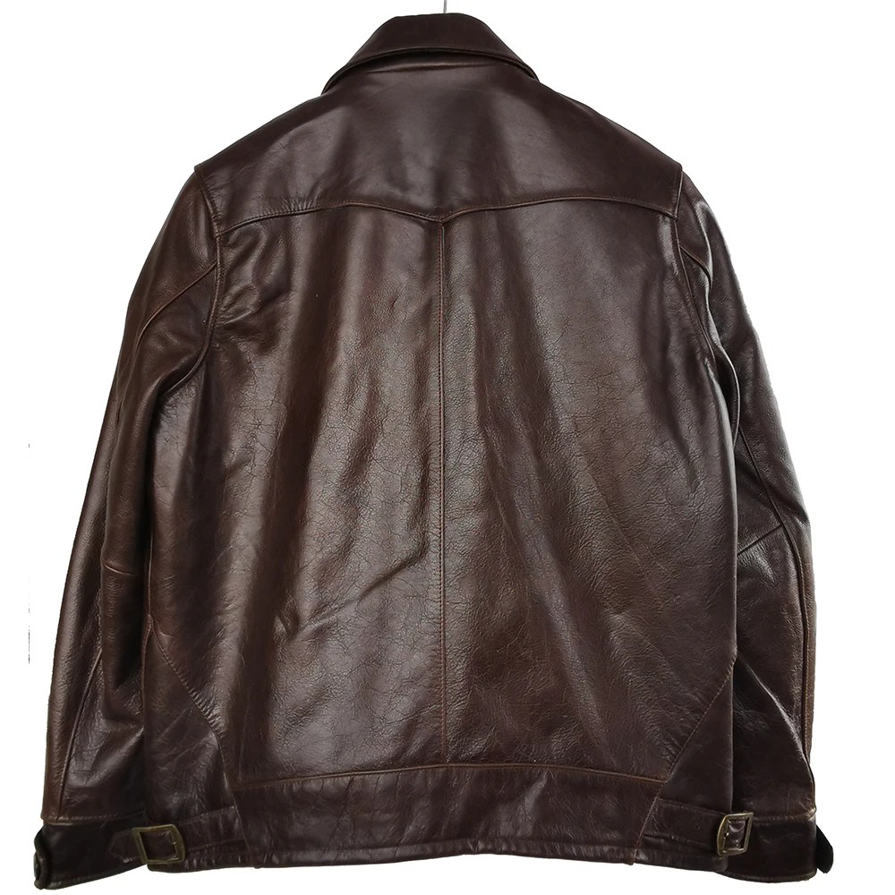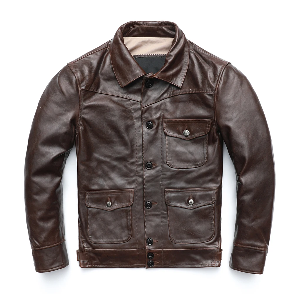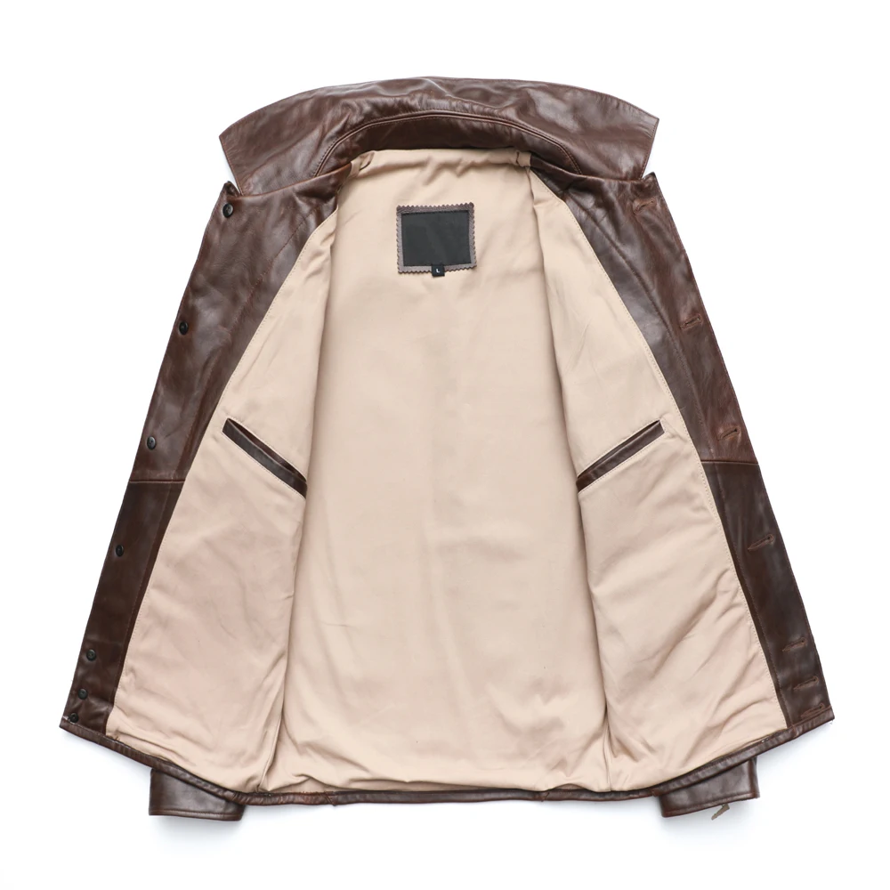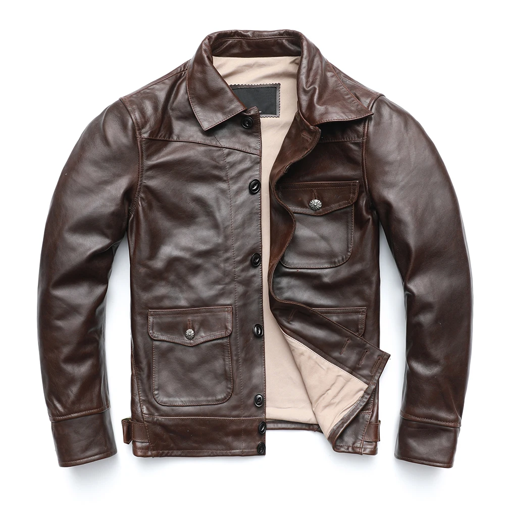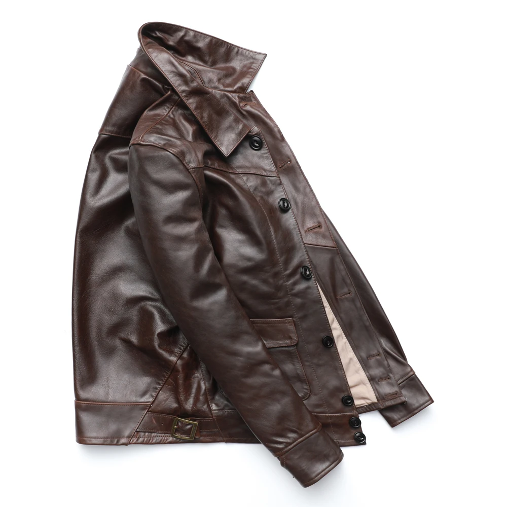 Men Leather Jacket Thick Turn Down Collar Dark Brown Solf Oil Wax Cowhide Skin Jacket Men Winter Coat Asian Size M-3XL M505