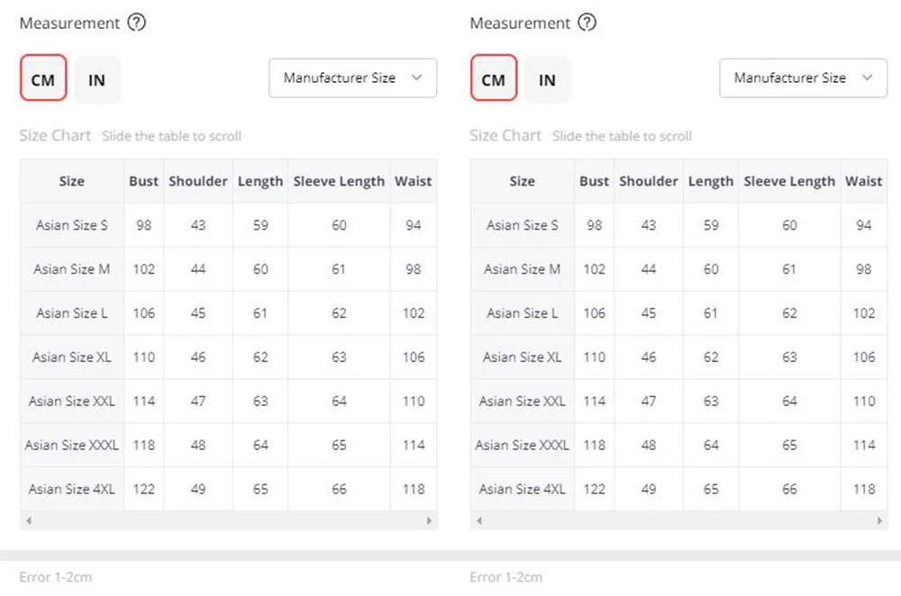 1. All measurements are in CM with 1-2cm measurment tolerance